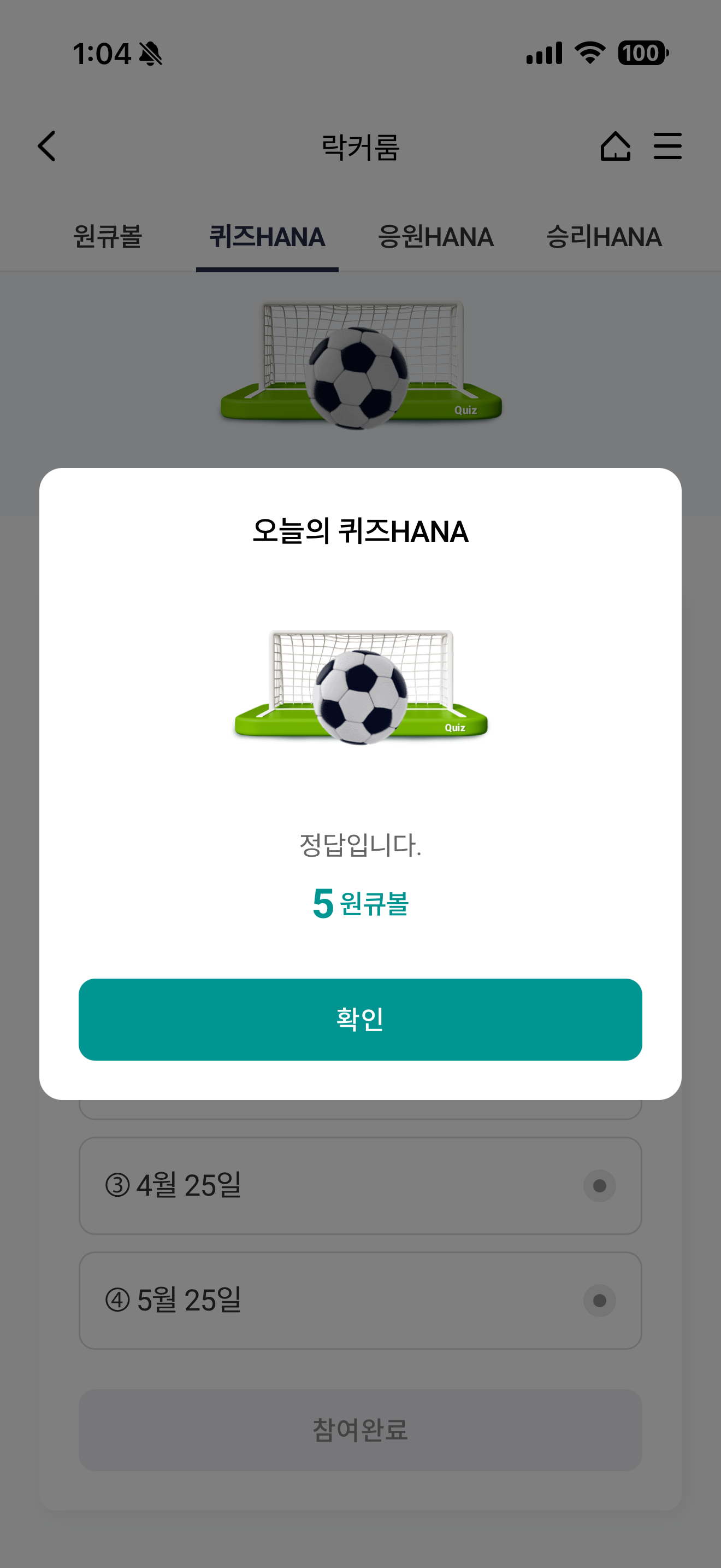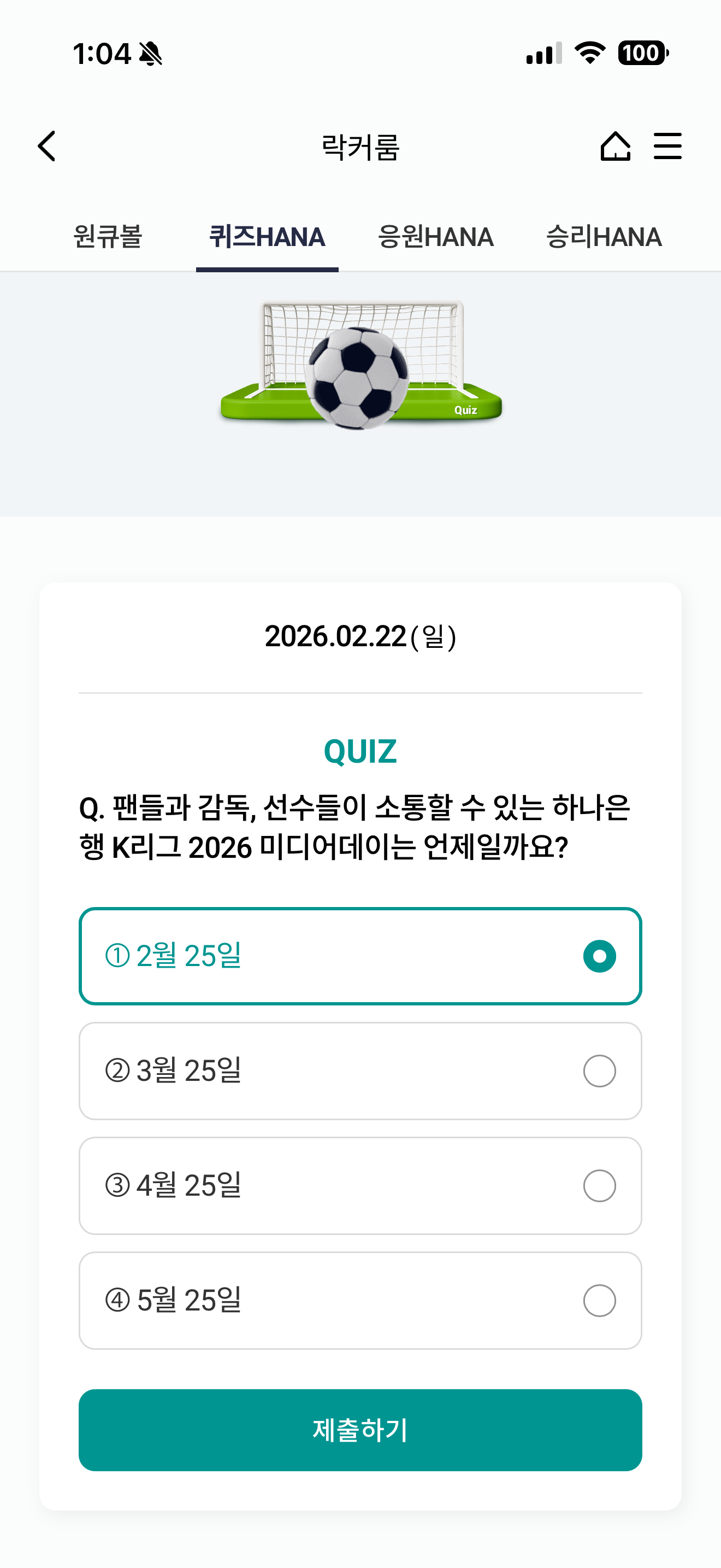 하나원큐 축구 play 퀴즈 HANA 정답은 2월 25일 입니다