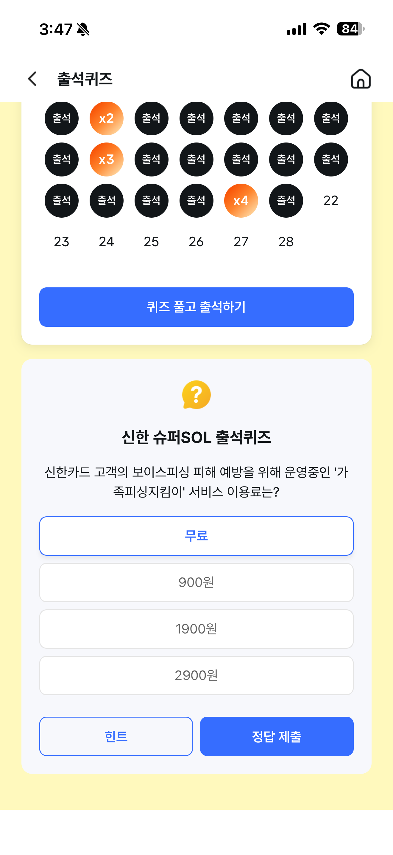 신한 슈퍼SOL 출석퀴즈 2월 22일 정답(신한카드 고객의 보이스피싱 피해 예방을 위해 운영중인 '가족피싱지킴이' 서비스 이용료는?)