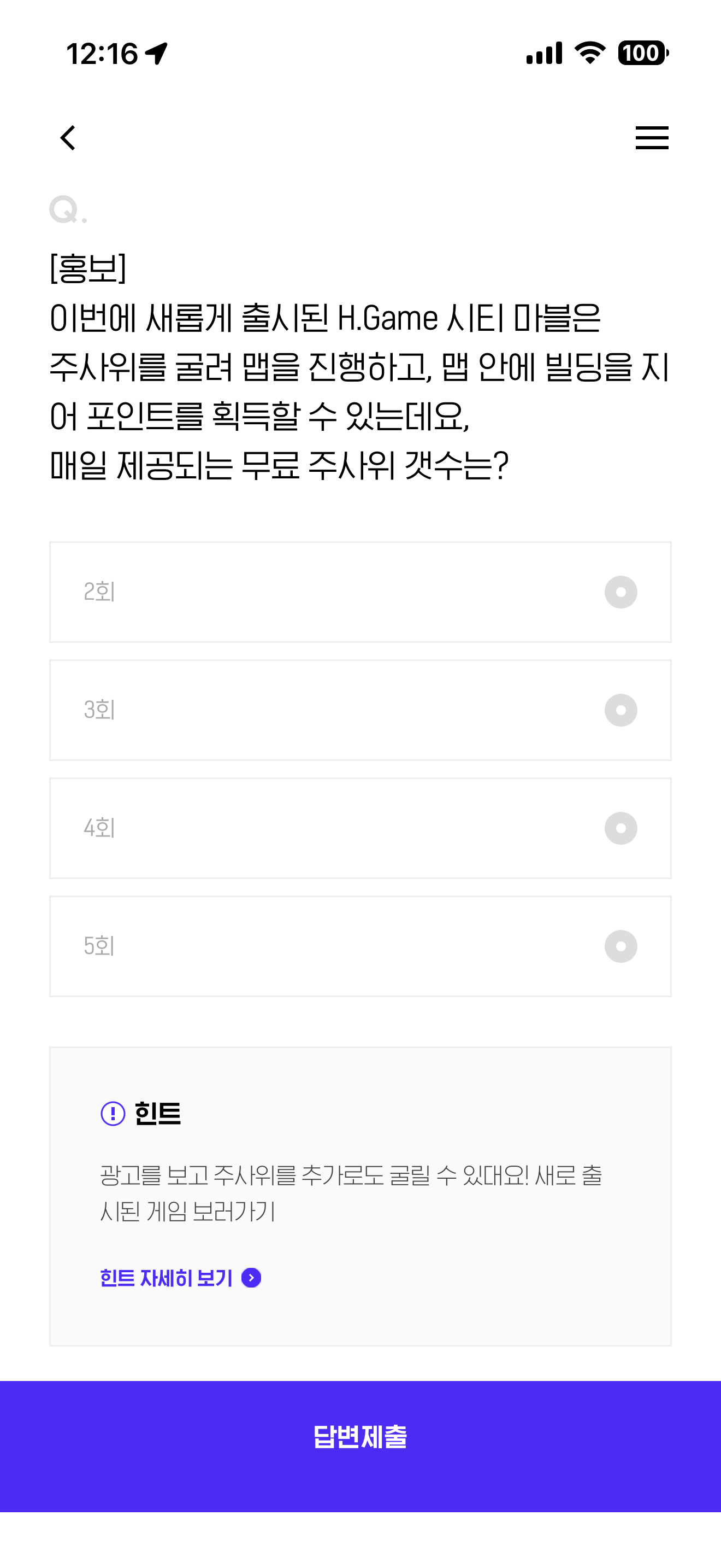 이번에 새롭게 출시된 H.Game 시티 마블은 주사위를 굴려 맵을 진행하고, 맵 안에 빌딩을 지어 포인트를 획득할 수 있는데요, 매일 제공되는 무료 주사위 갯수는? 보기는 1. 2회 2. 3회 3. 4회 4. 5회 입니다.