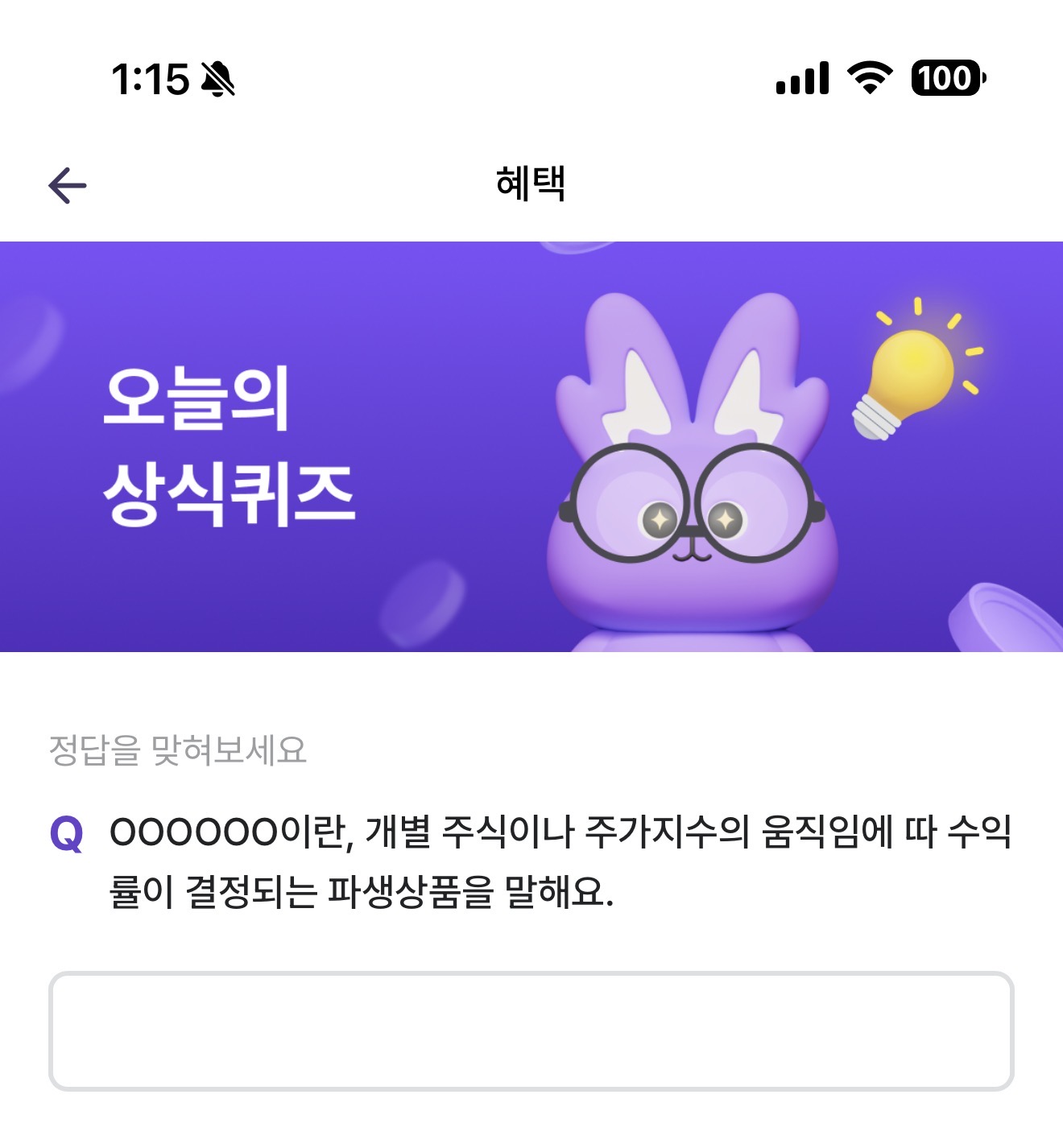 OOOOOO이란, 개별 주식이나 주가지수의 움직임에 따 수익률이 결정되는 파생상품을 말해요. 주관식 퀴즈인데요. 요즘은 주식 투자가 열풍이죠. 주가지수의 움직임에 따라 수익률이 결정되는 파생상품입니다.