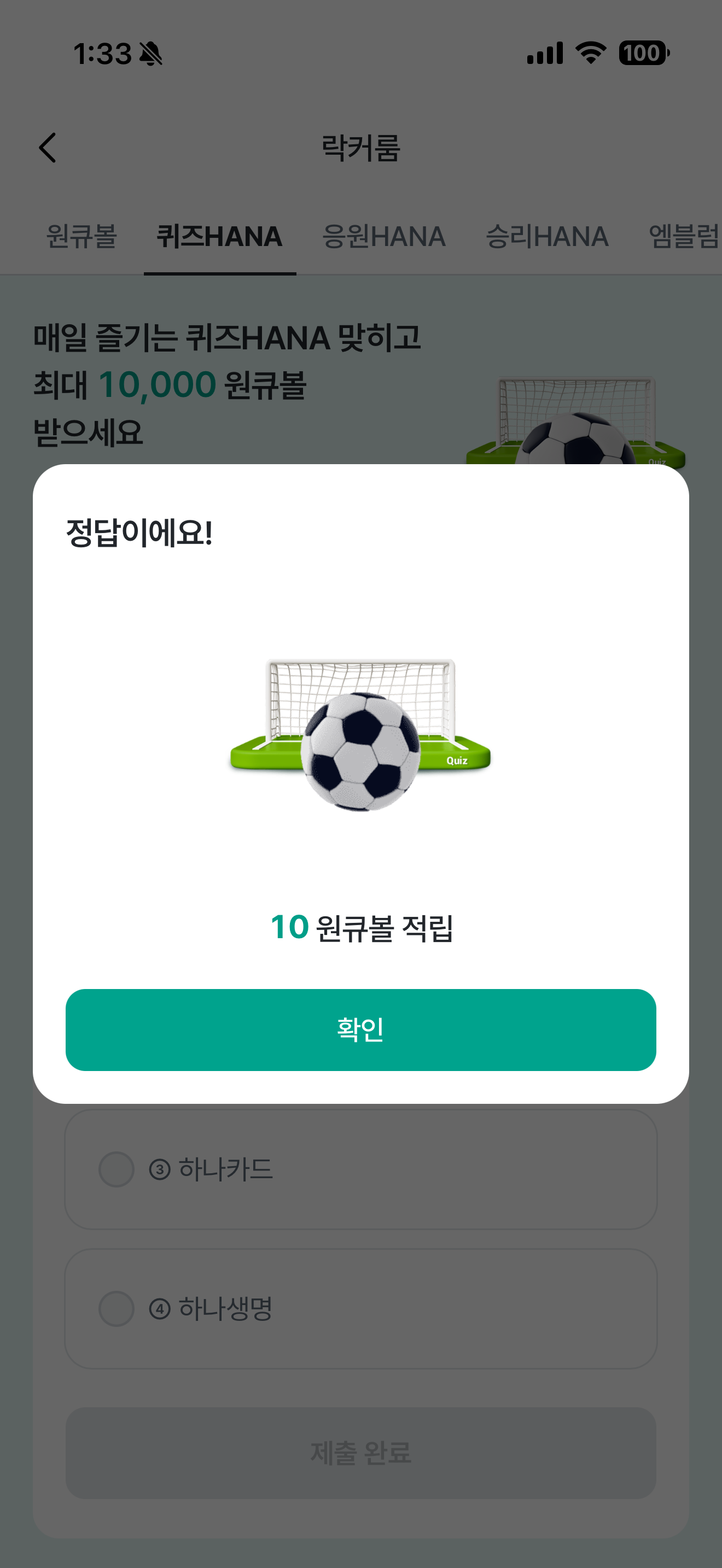 하나원큐 축구 play 퀴즈 HANA 정답은 하나은행 입니다