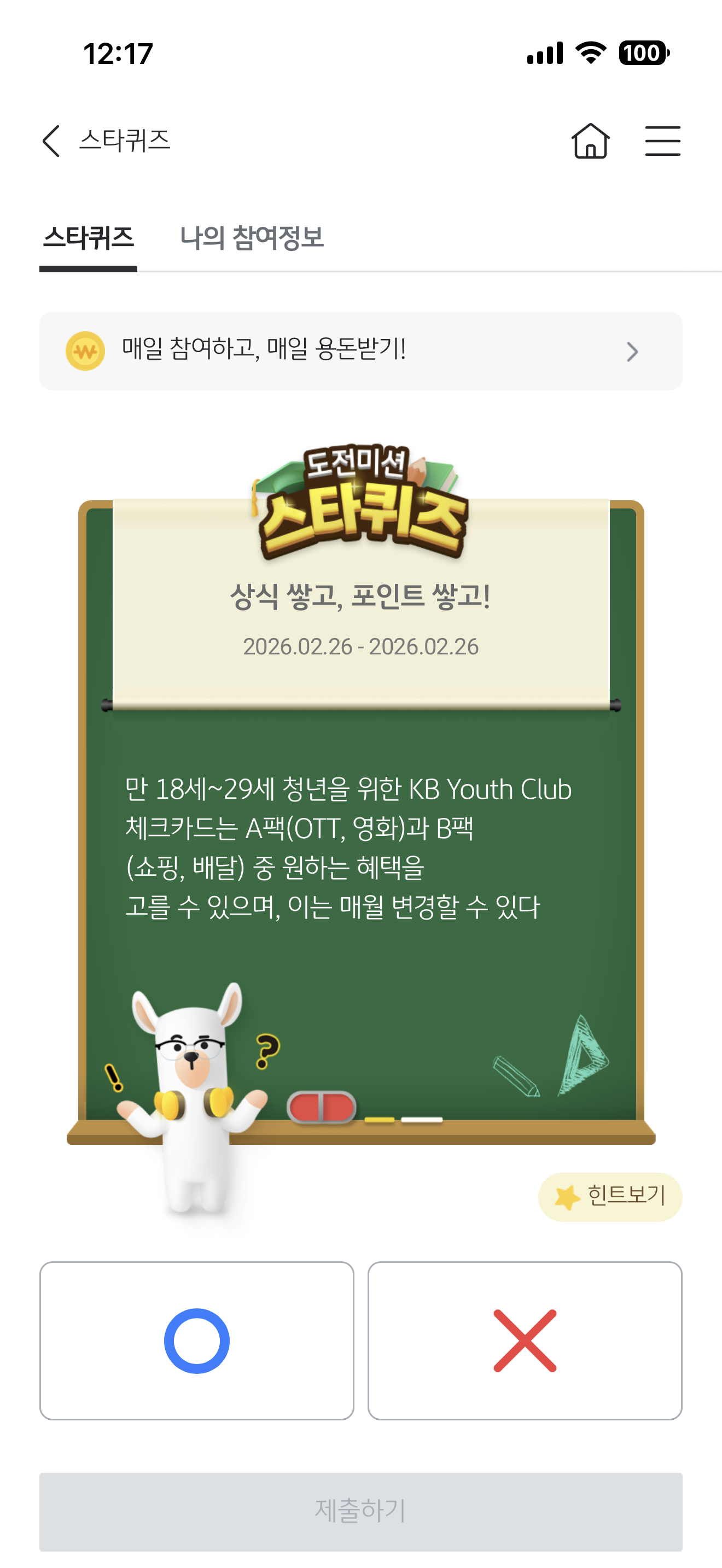 KB스타뱅킹 스타퀴즈 2월 26일 정답(만 18세~29세 청년을 위한 KB Youth Club 체크카드는 A팩(OTT, 영화)과 B팩(쇼핑, 배달) 중 원하는 혜택을 고를 수 있으며, 이는 매월 변경할 수 있다)