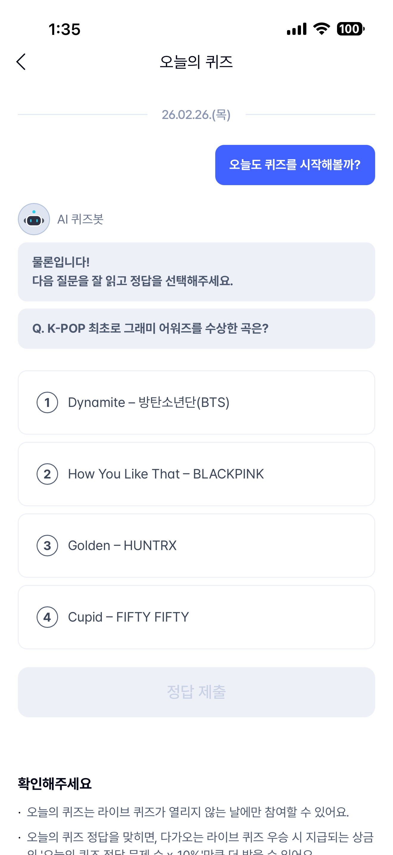 K-POP 최초로 그래미 어워즈를 수상한 곡은? 보기는 1. Dynamite-방탄소년단(BTS) 2. How You Like That-BLACKPINK 3. Golden-HUNTRX 4. Cupid-FiFTY FIFTY 입니다.