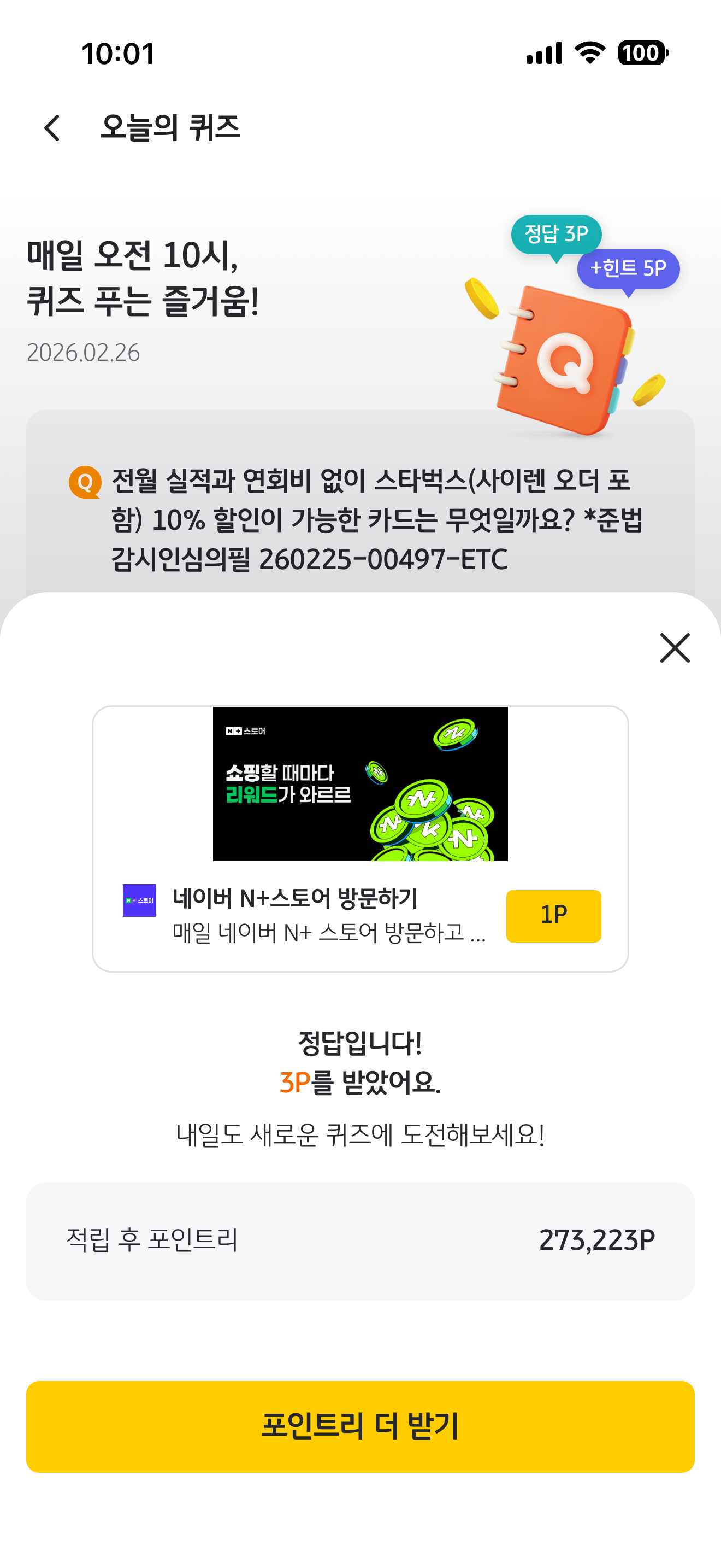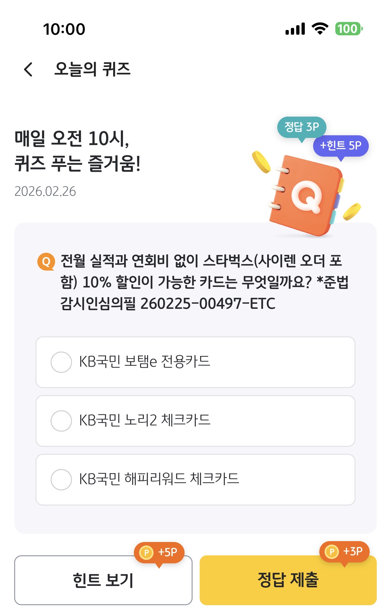 KB Pay 오늘의 퀴즈 정답은 KB국민 노리2 체크카드 입니다
