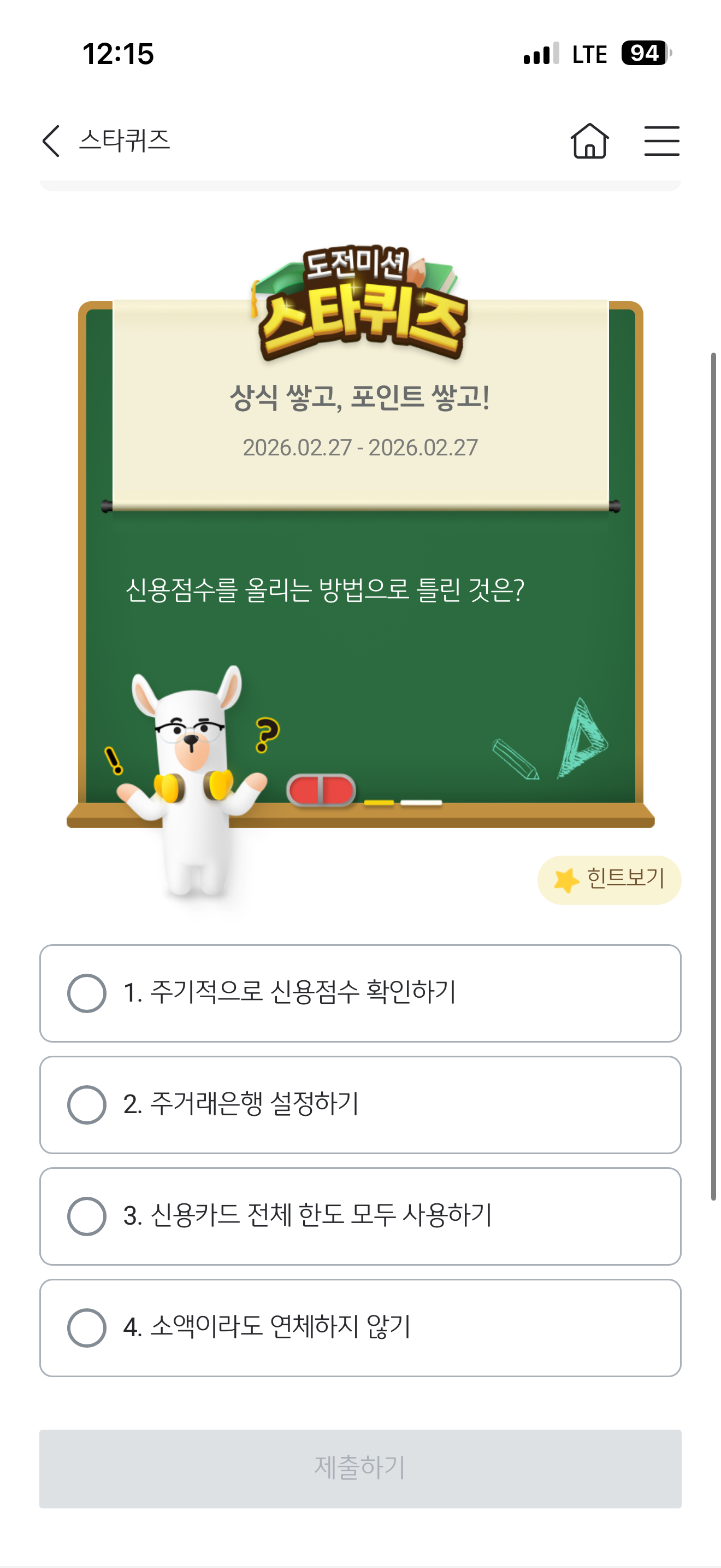 KB스타뱅킹 스타퀴즈 2월 27일 정답(신용점수를 올리는 방법으로 틀린 것은?)