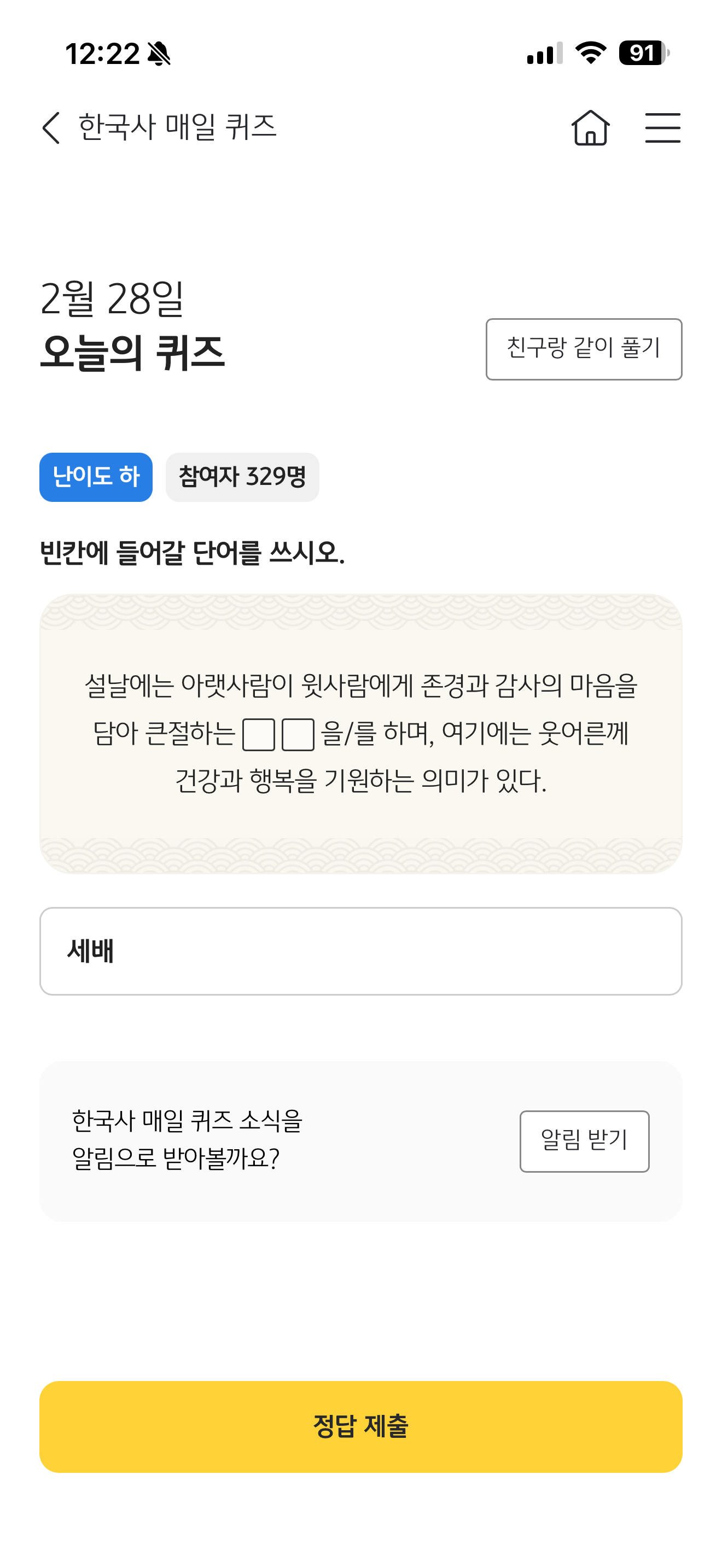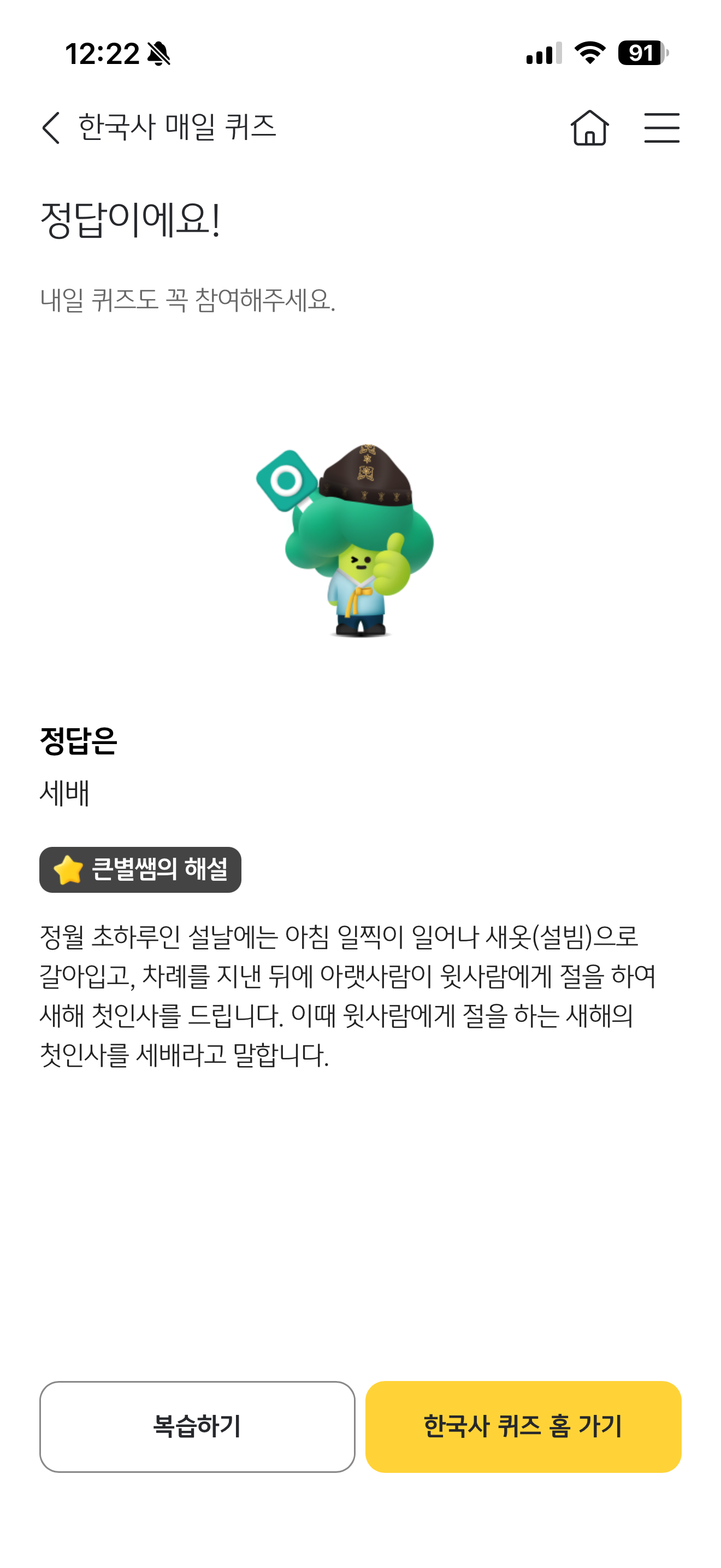 KB스타뱅킹 한국사 매일 퀴즈 정답은 세배 입니다