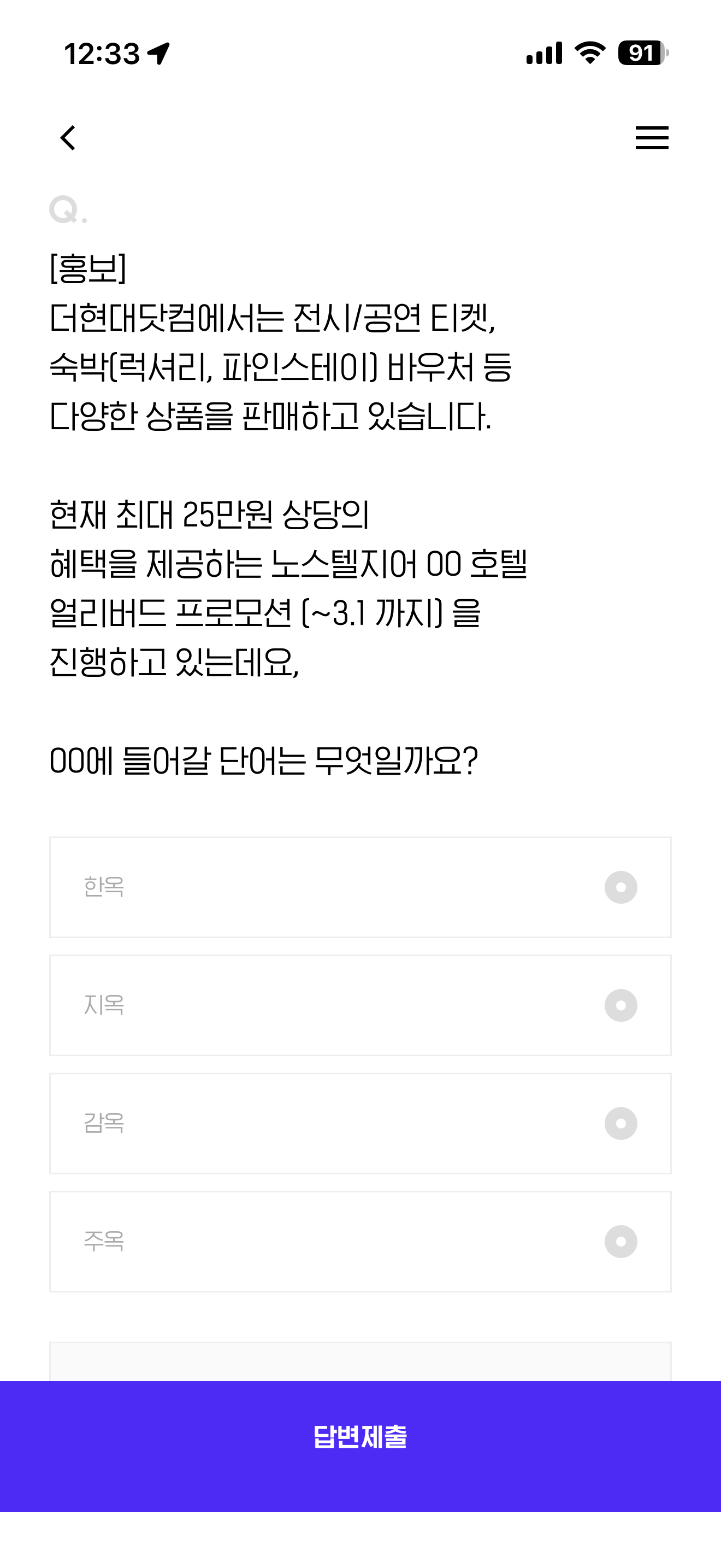 더현대닷컴에서는 전시/공연 티켓, 숙박(럭셔리, 파인스테이) 바우처 등 다양한 상품을 판매하고 있습니다. 현재 최대 25만원 상당의 혜택을 제공하는 노스텔지어 OO 호텔 얼리버드 프로모션 (~3.1 까지) 을 진행하고 있는데요, OO에 들어갈 단어는 무엇일까요? 보기는 1. 한옥 2. 지옥 3. 감옥 4. 주옥 입니다