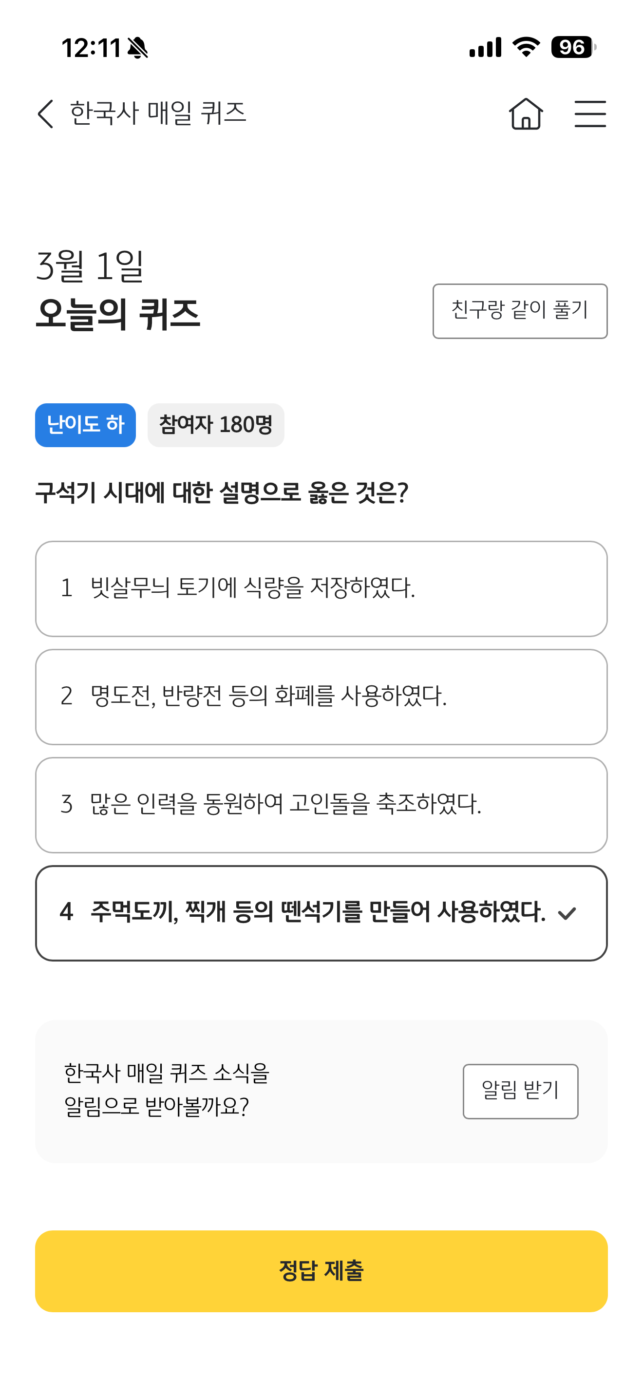KB스타뱅킹 한국사 매일 퀴즈 3월 1일 정답(구석기 시대에 대한 설명으로 옳은 것은?)
