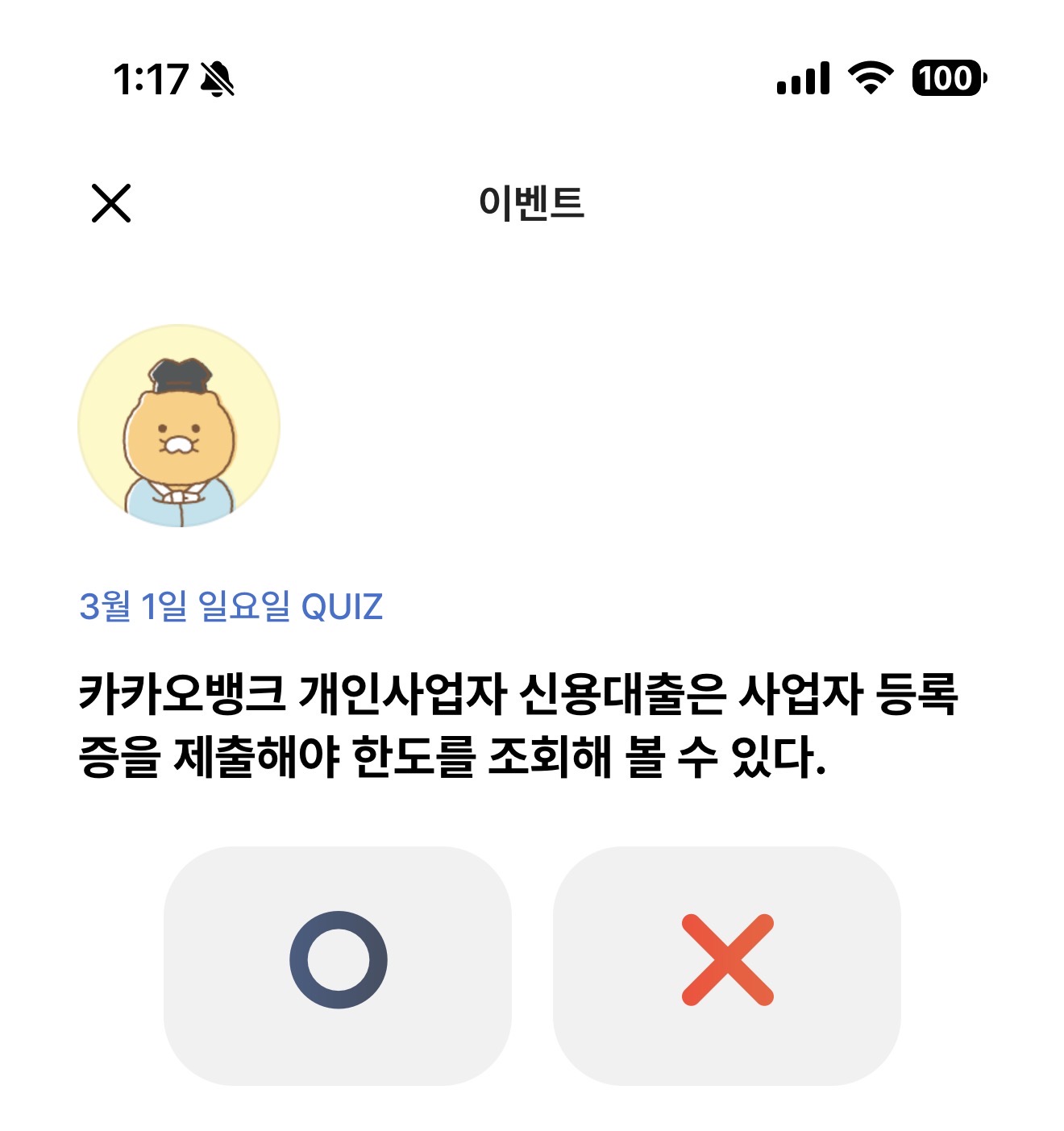 카카오뱅크 OX 퀴즈 정답은 X 입니다