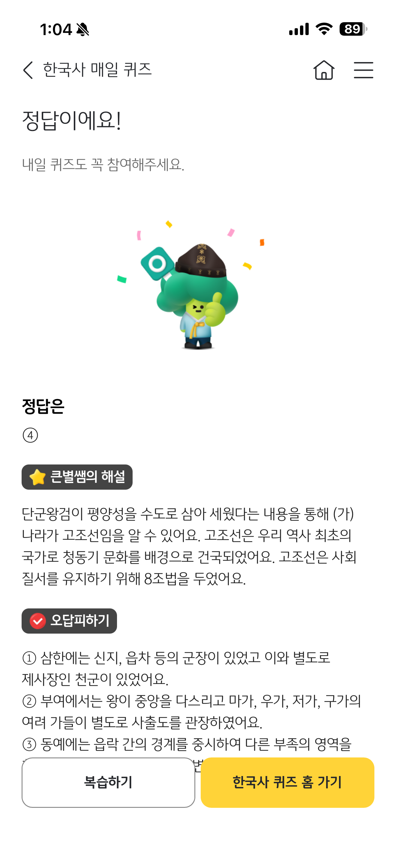 한국사 매일 퀴즈 정답은 사회 질서를 유지하기 위해 8조법을 두었다 입니다.