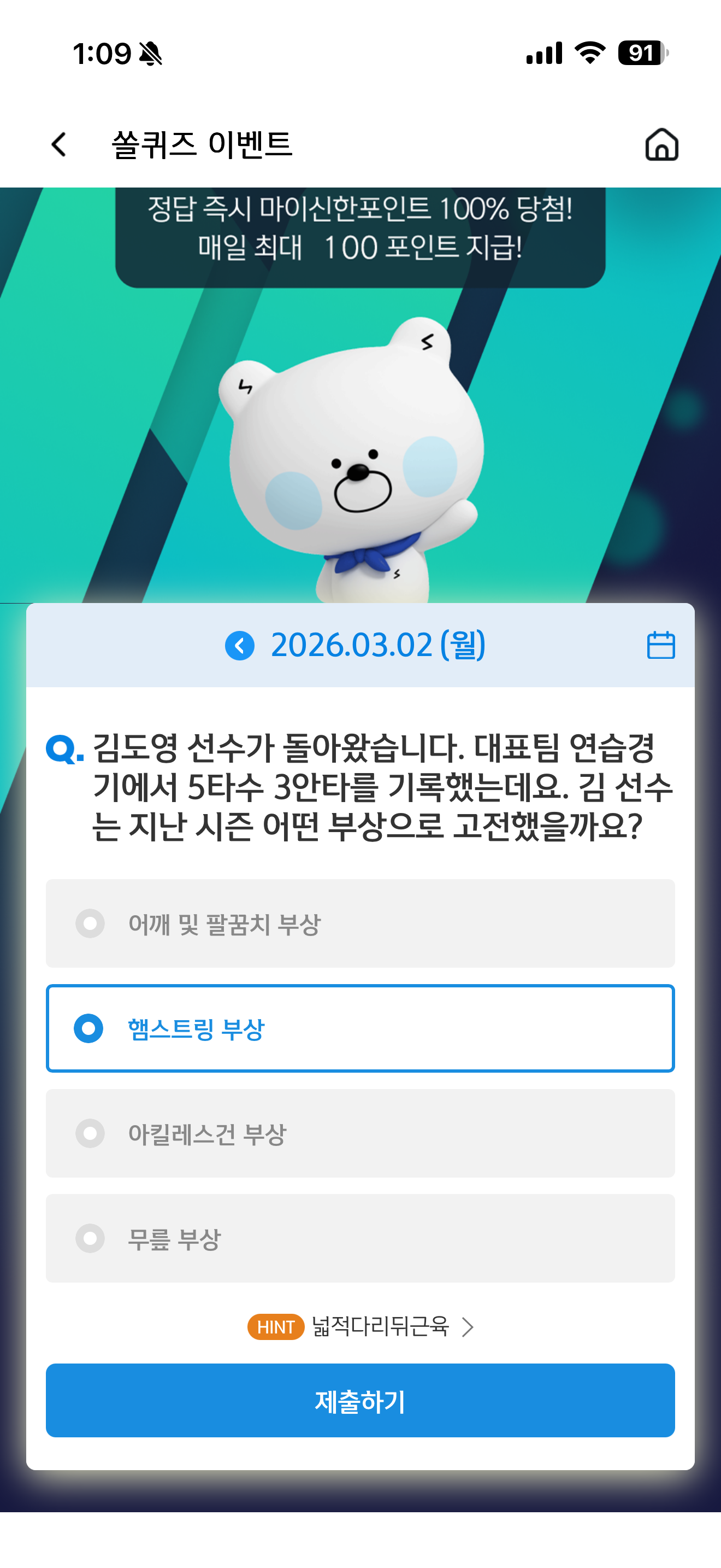 신한 슈퍼SOL 야구/상식 쏠퀴즈 정답은 햄스트링 부상 입니다