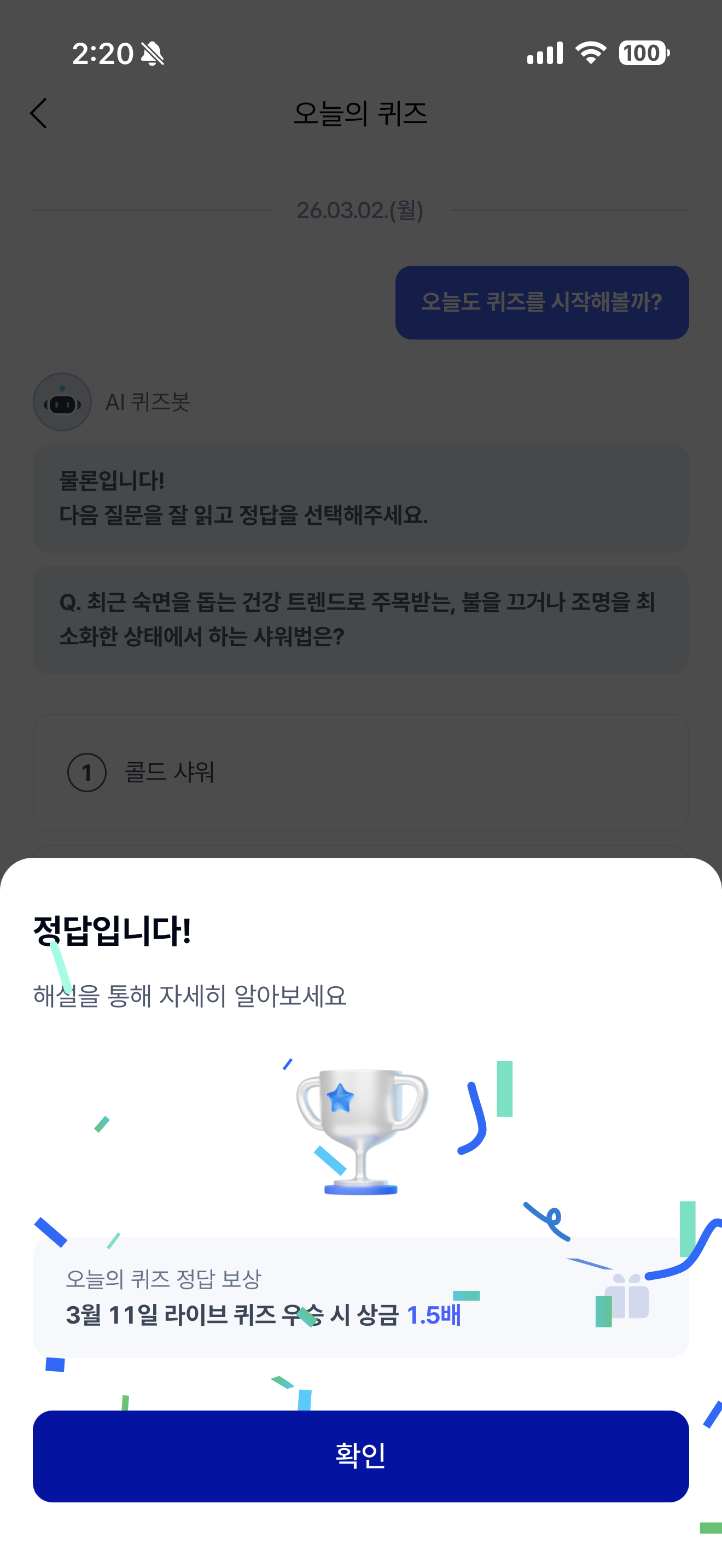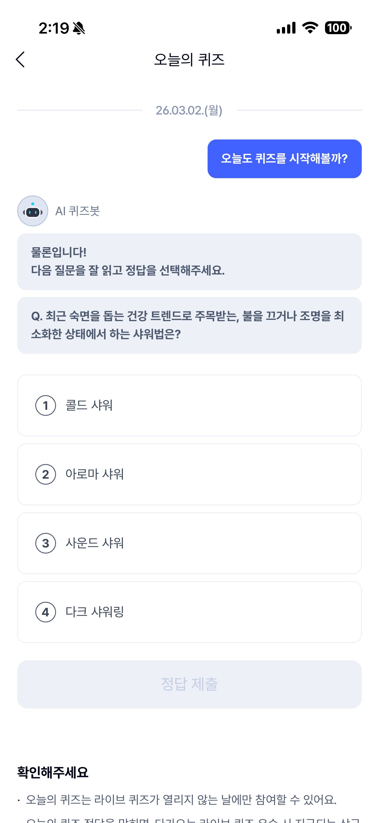 케이뱅크 AI 퀴즈 챌린지 3월 2일 정답(최근 숙면을 돕는 건강 트렌드로 주목받는, 불을 끄거나 조명을 최소화한 상태에서 하는 샤워법은?)