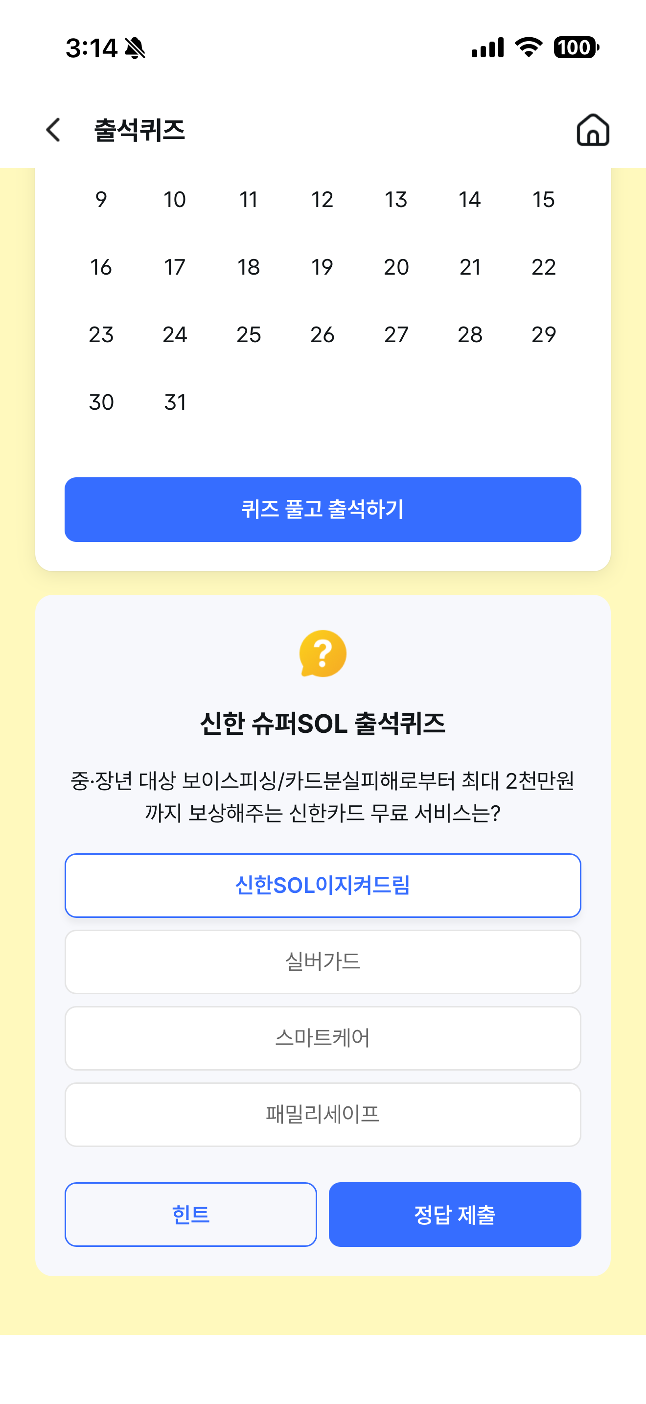 신한 슈퍼SOL 출석퀴즈 정답은 신한SOL이지켜드림 입니다