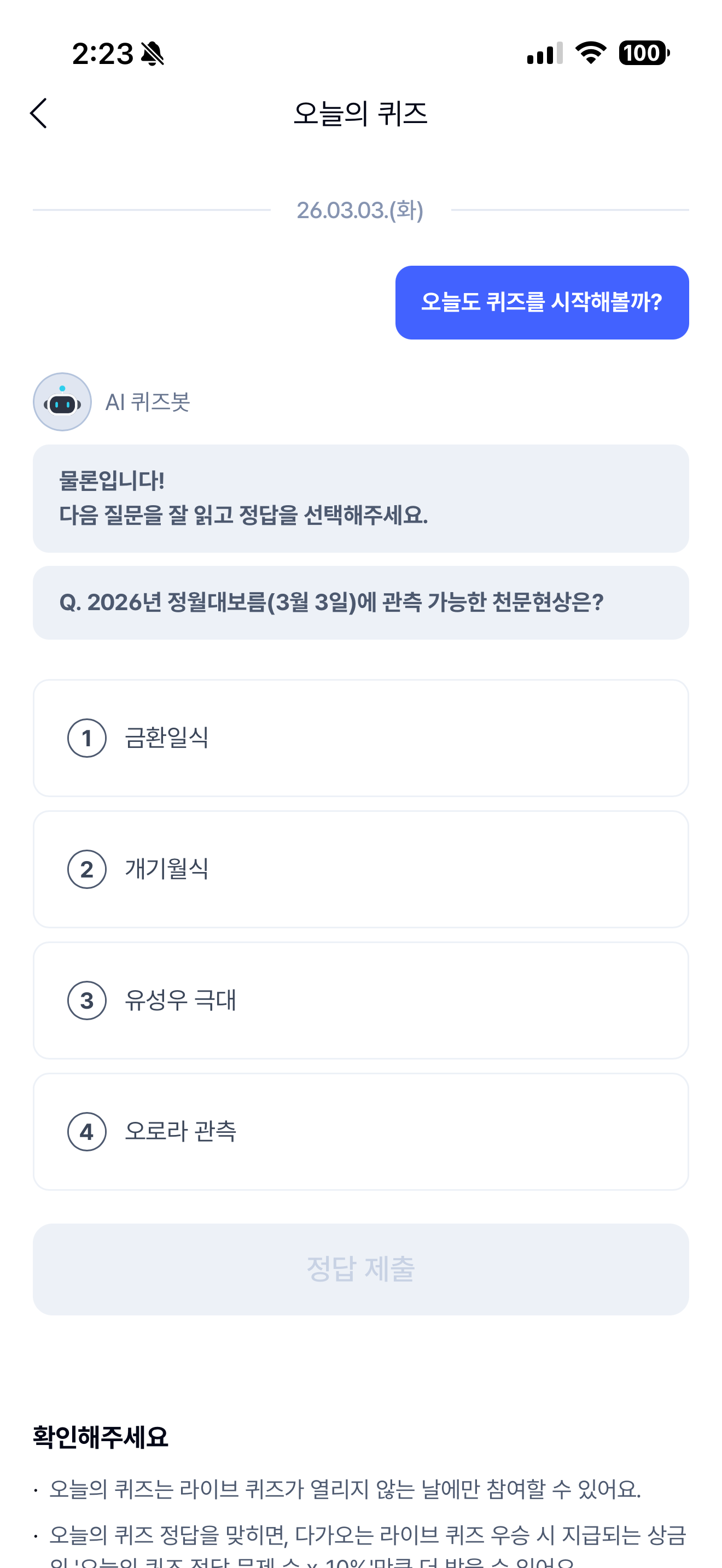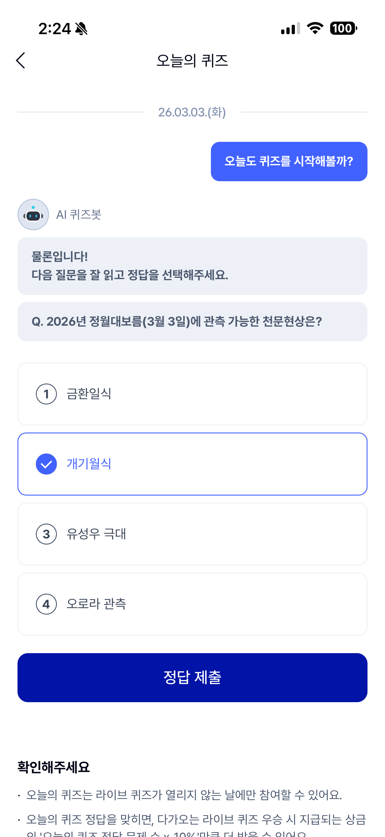 2026년 정월대보름(3월 3일)에 관측 가능한 천문현상은? 보기는 1. 금환일식 2. 개기월식 3. 유성우 극대 4. 오로라 관측 입니다. 3월 3일은 정월대보름 입니다. 참고해 두세요