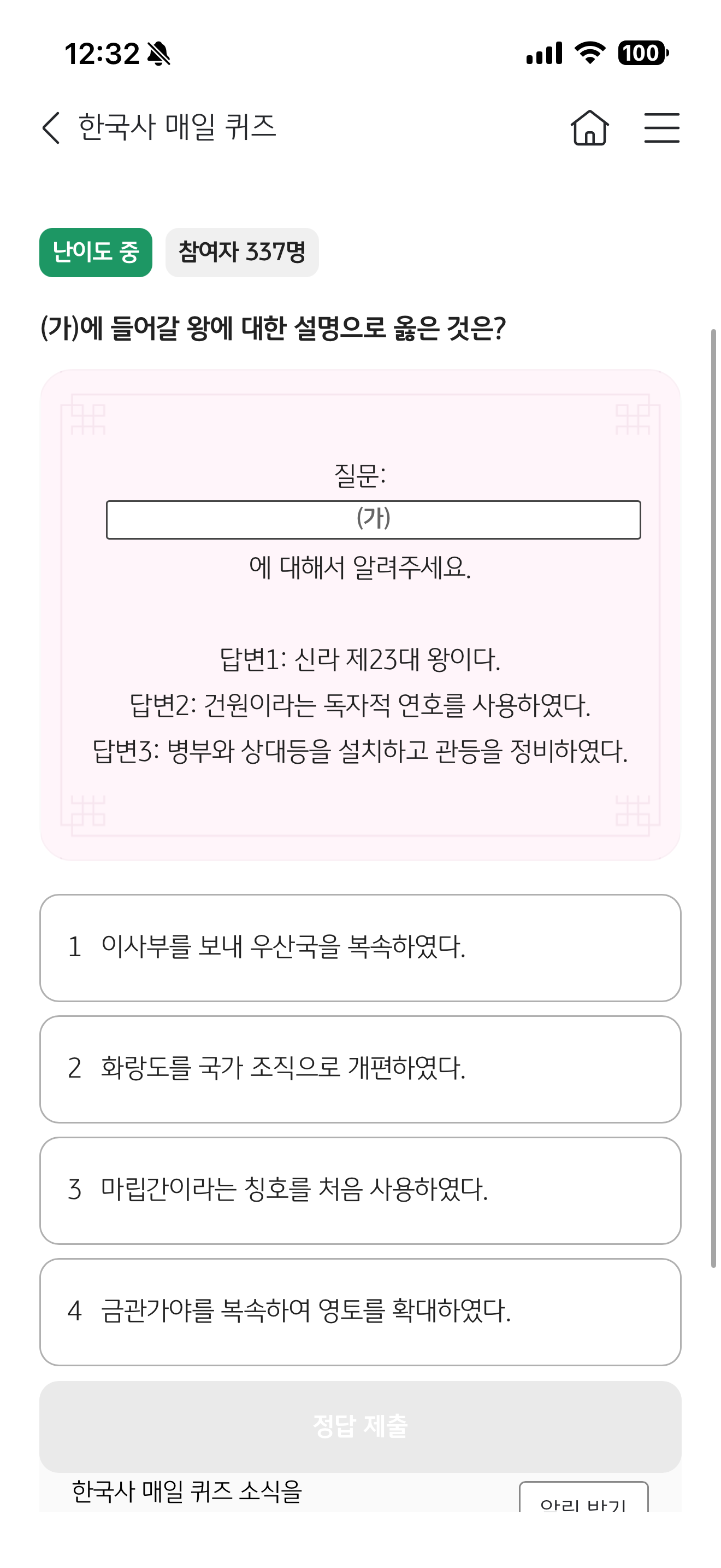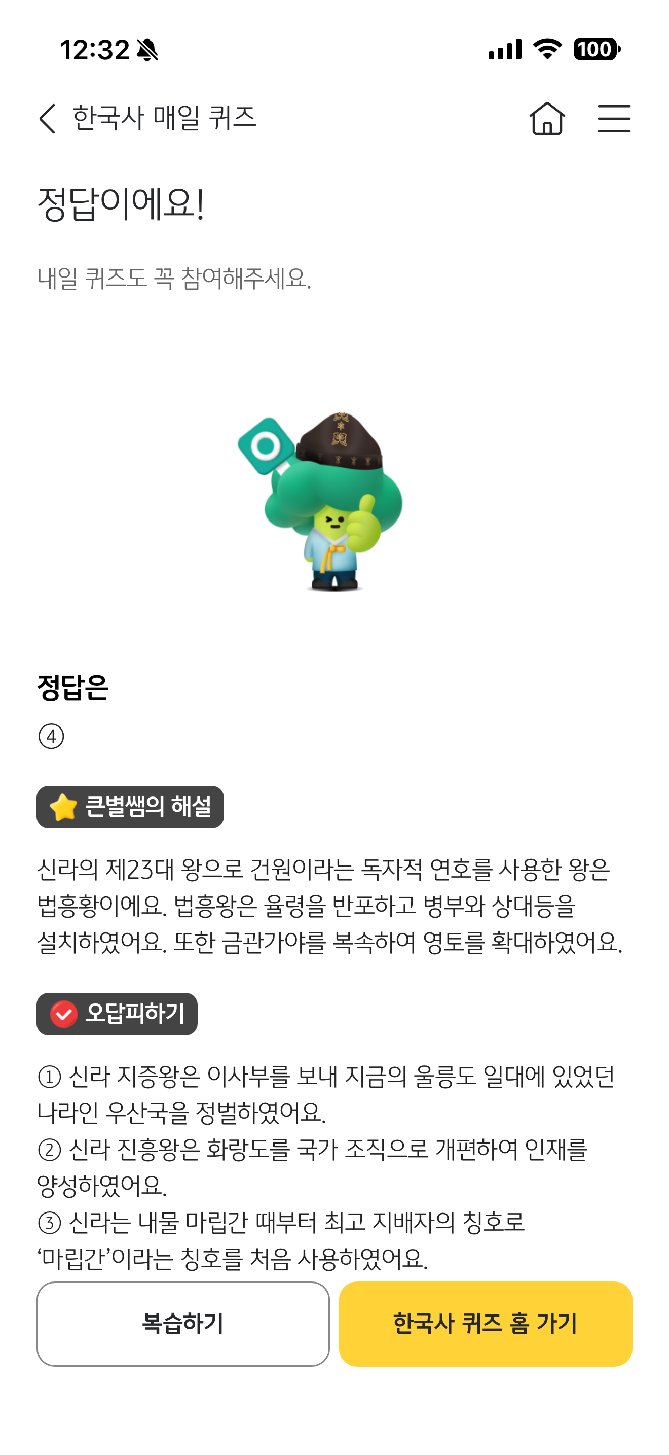 KB스타뱅킹 한국사 매일 퀴즈 3월 4일 정답((가)에 대해서 알려주세요. 답변1: 신라 제23대 왕이다. 답변2: 건원이라는 독자적 연호를 사용하였다 답변3:병부와 상대등을 설치하고 관등을 정비하였다)