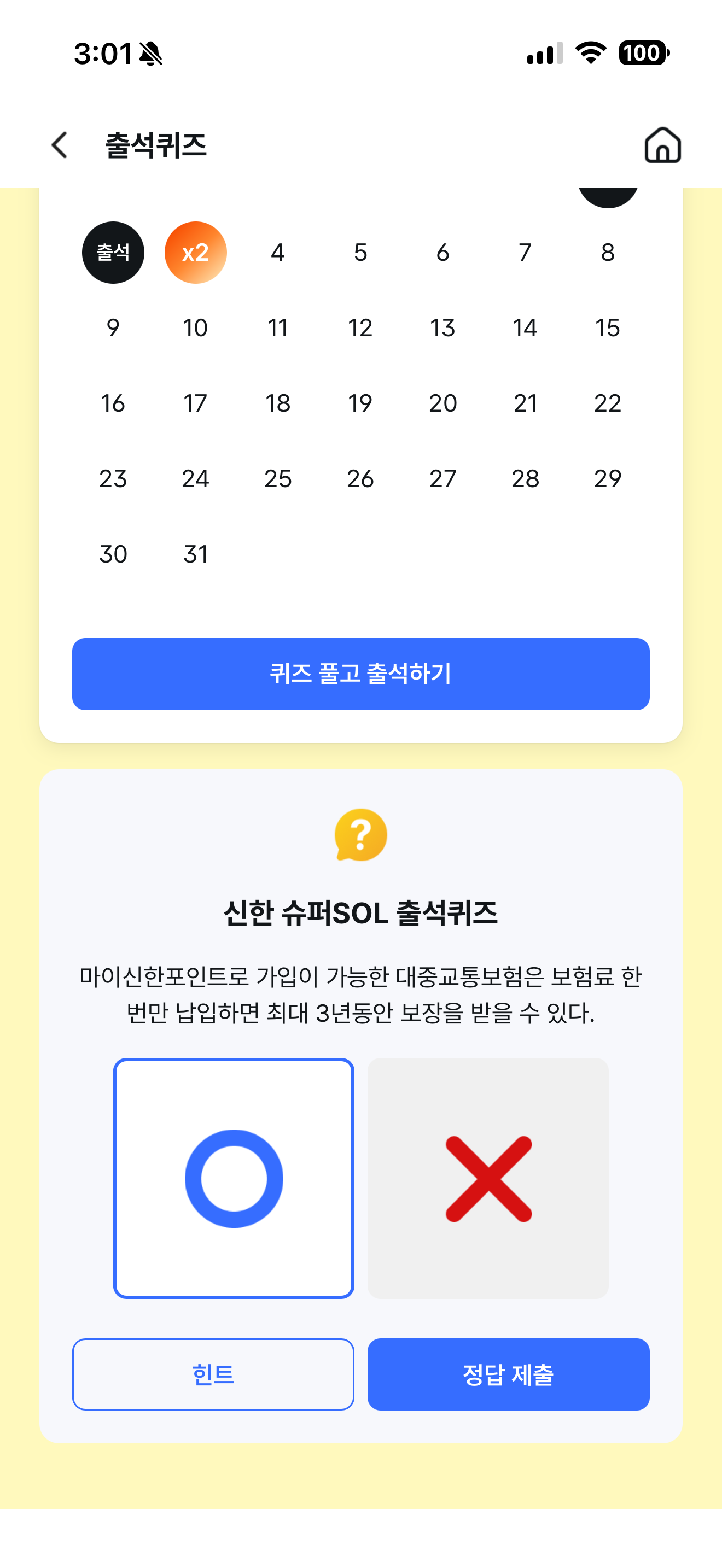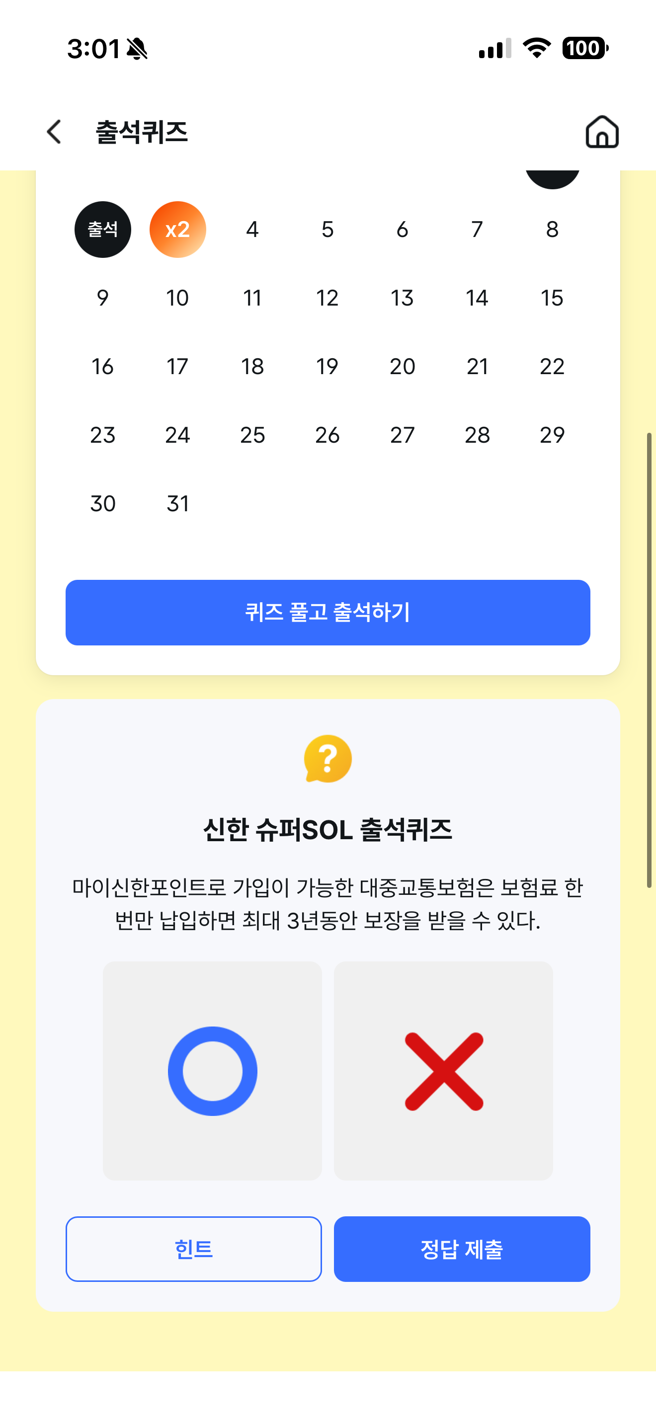 신한 슈퍼SOL 출석퀴즈 정답은 O 입니다