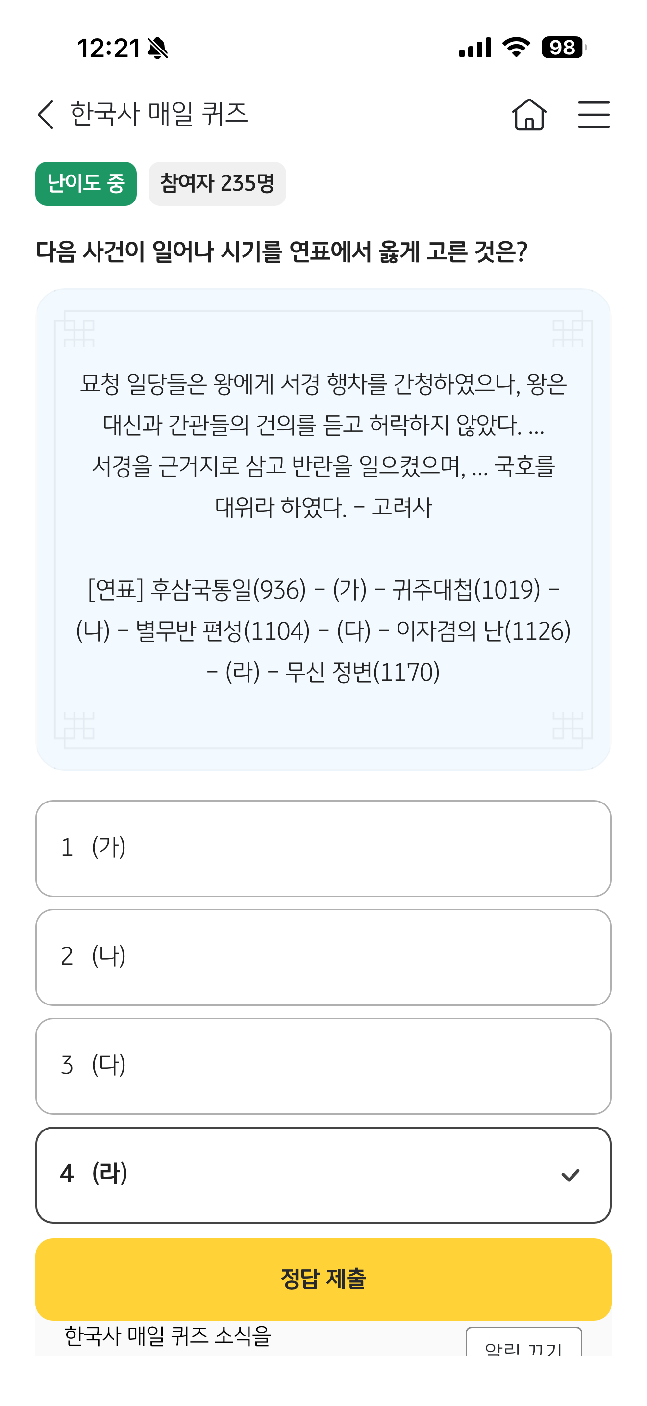 KB스타뱅킹 한국사 매일 퀴즈 정답은 (라) 입니다