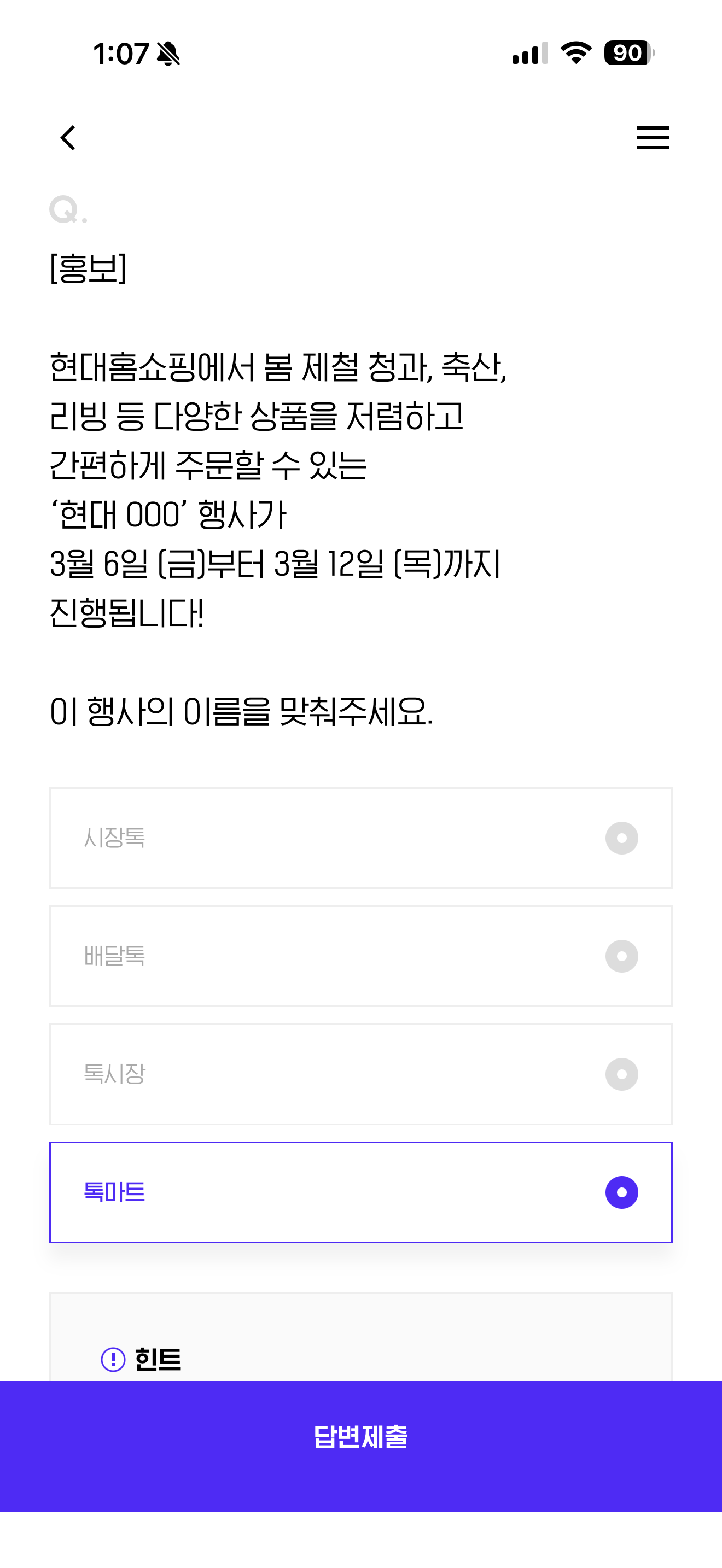 현대홈쇼핑에서 봄 제철 청과, 축산, 리빙 등 다양한 상품을 저렴하고 간편하게 주문할 수 있는 '현대 000' 행사가 3월 6일 (금)부터 3월 12일 (목)까지 진행됩니다! 이 행사의 이름을 맞춰주세요 보기는 1. 시장톡 2. 배달톡 3. 톡시장 4. 톡마트 입니다