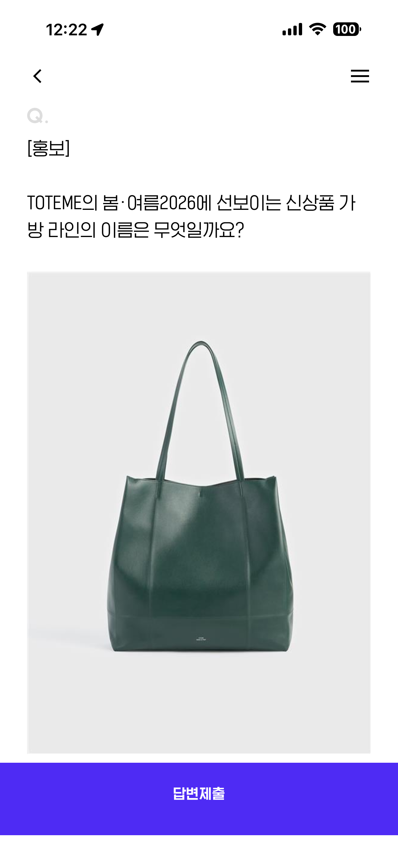 H포인트 퀴즈 3월 9일 정답(TOTEME의 봄 여름2026에 선보이는 신상품 가방 라인의 이름은 무엇일까요?)
