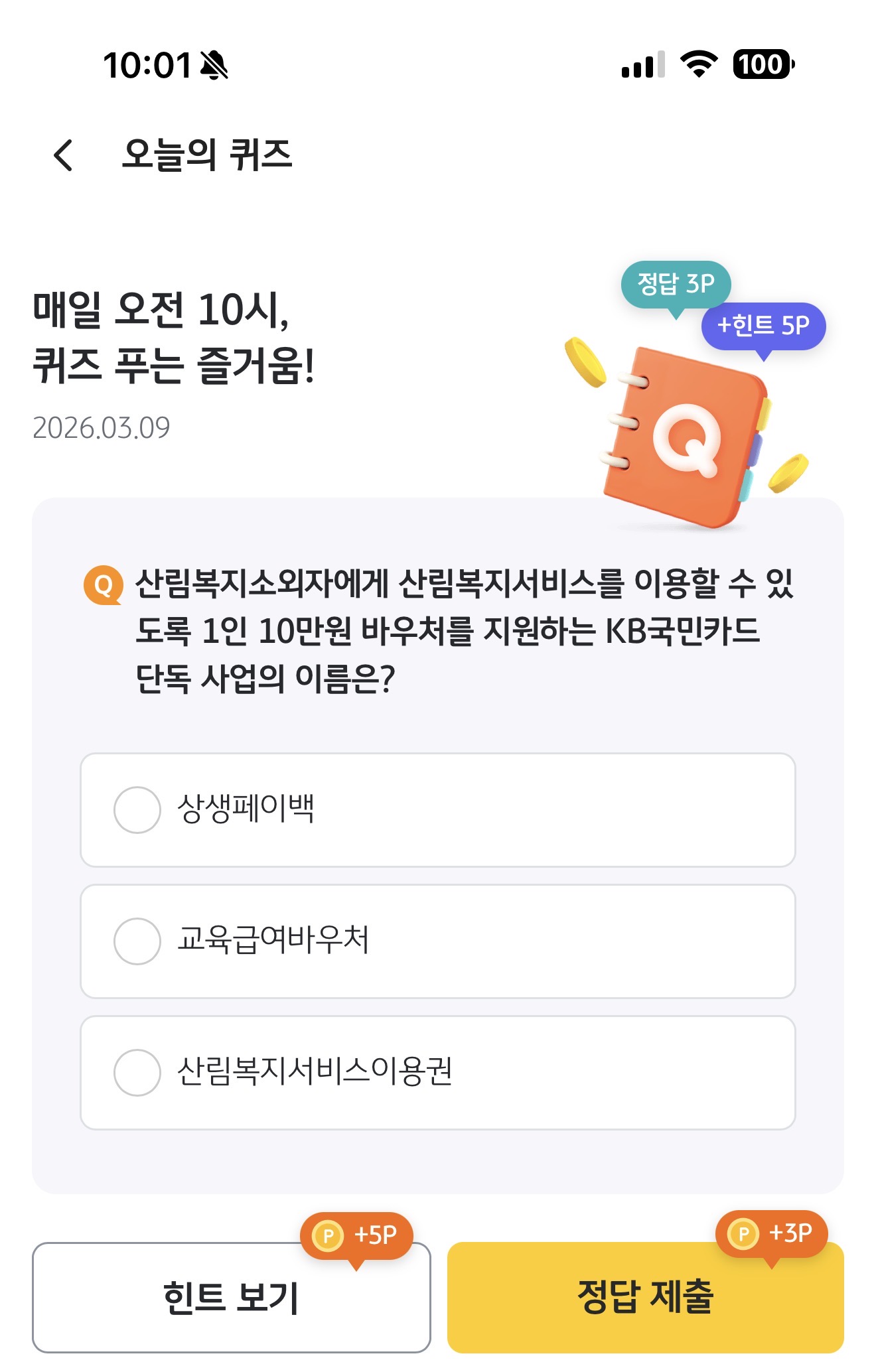 KB Pay 오늘의 퀴즈 정답은 산림복지서비스이용권 입니다