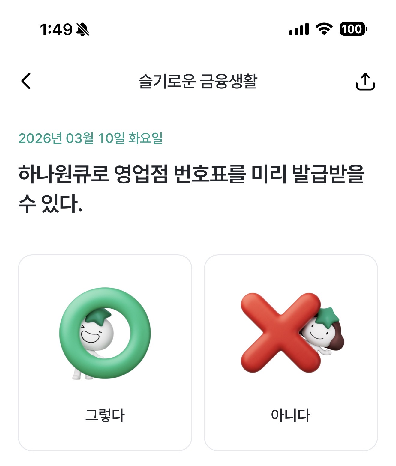 하나원큐로 영업점 번호표를 미리 발급받을 수 있다. O, X 퀴즈인데요. 요즘은 오프라인 은행도 앱과 연계하여 스마트하게 이용할 수 있는데요. 과연 하나원큐에서 영업점 번호표를 미리 받을 수 있을까요?