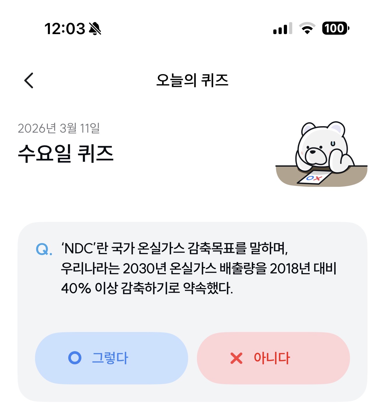 'NDC'란 국가 온실가스 감축목표를 말하며, 우리나라는 2030년 온실가스 배출량을 2018년 대비 40% 이상 감축하기로 약속했다. 그렇다 아니다 선택하면 되는데요. NDC가 뭘까요? 40% 이상 감축은 어떤 노력이 이뤄져야 할까요?
