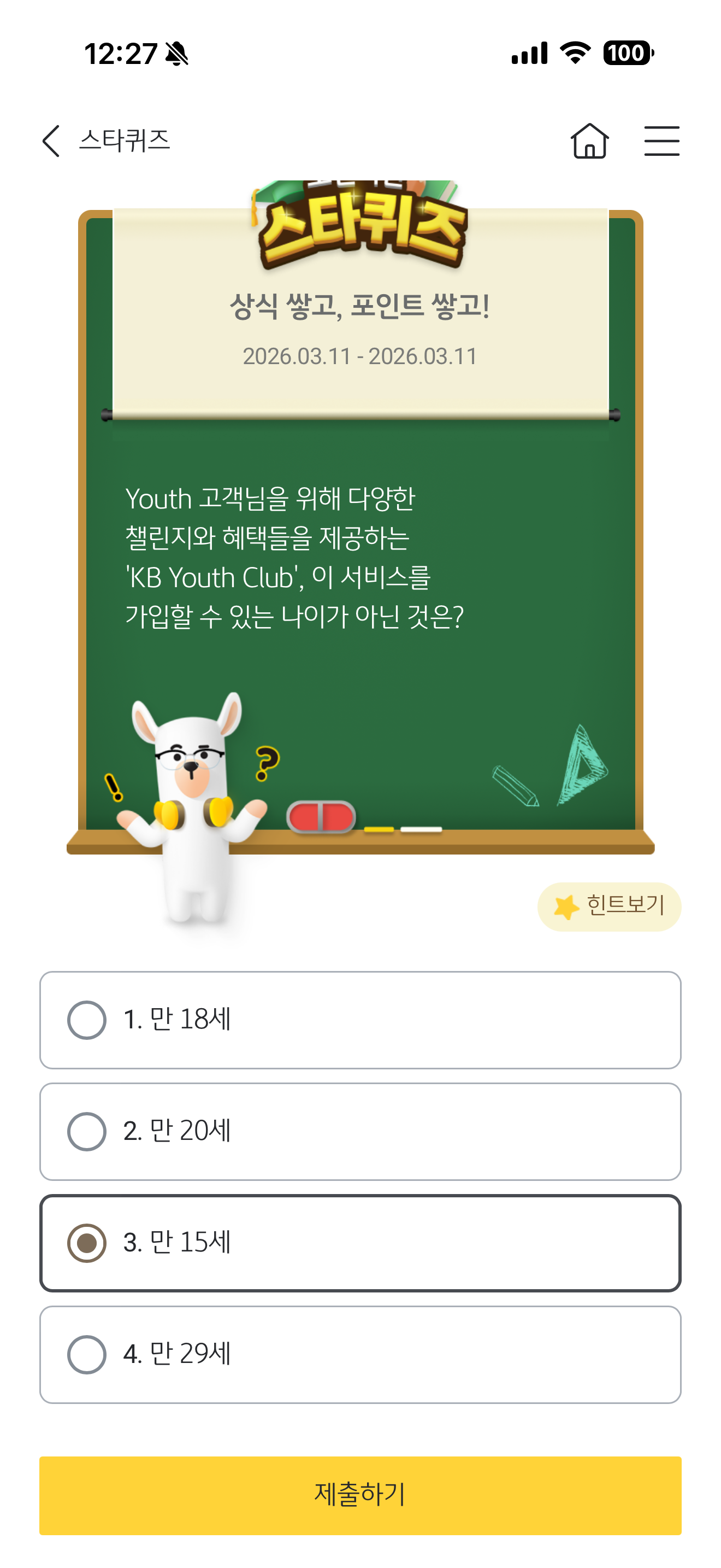 KB스타뱅킹 스타퀴즈 정답은 만 15세 입니다