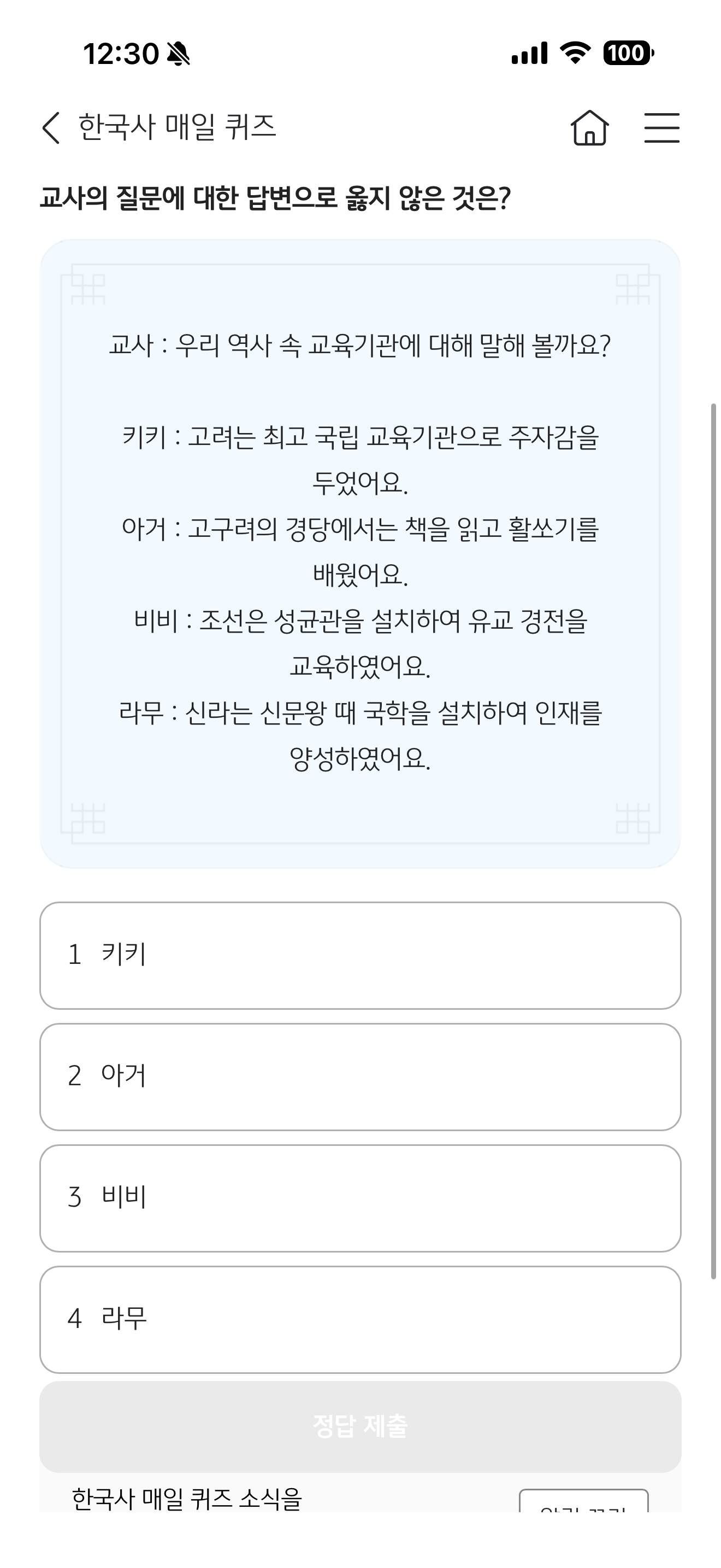 KB스타뱅킹 한국사 매일 퀴즈 3월 11일 정답(교사의 질문에 대한 답변으로 옳지 않은 것은? 교사 : 우리 역사 속 교육기관에 대해 말해 볼까요? 키키 : 고려는 최고 국립 교육기관으로 주자감을 두었어요)