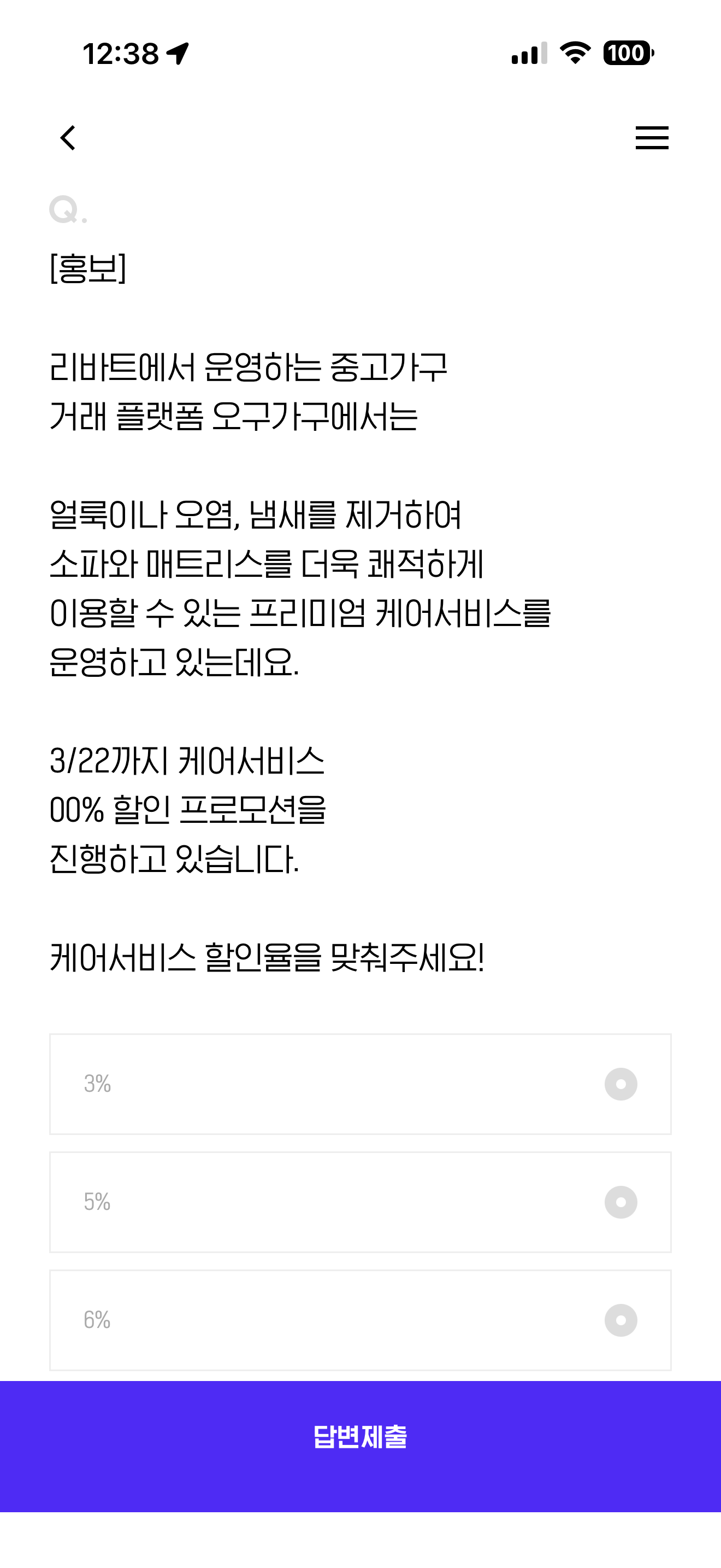 리바트에서 운영하는 중고가구 거래 플랫폼 오구가구에서는 얼룩이나 오염, 냄새를 제거하여 소파와 매트리스를 더욱 쾌적하게 이용할 수 있는 프리미엄 케어서비스를 운영하고 있는데요. 3/22까지 케어서비스 00% 할인 프로모션을 진행하고 있습니다. 캐어서비스 할인율을 맞춰주세요!