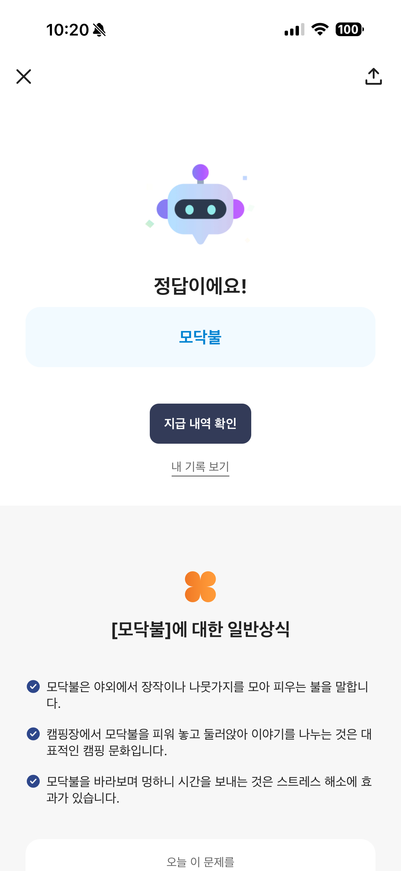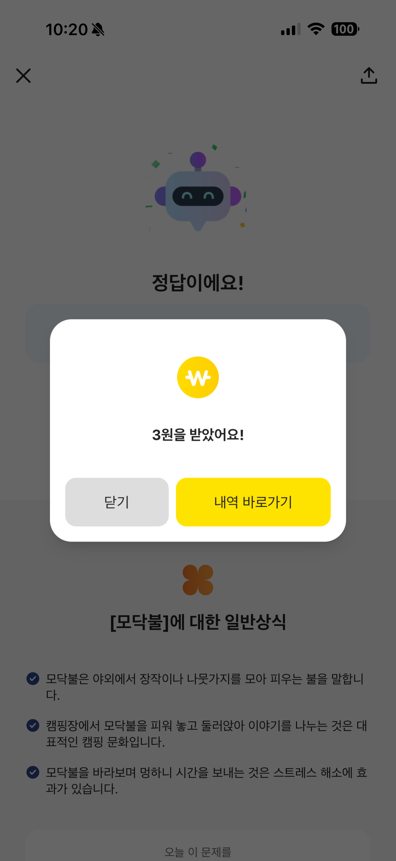 카카오뱅크 AI 퀴즈 정답은 모닥불 입니다