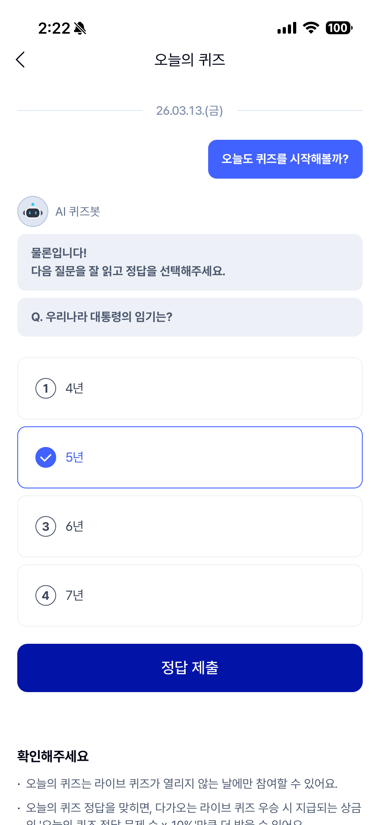 케이뱅크 AI 퀴즈 챌린저 정답은 5년 입니다