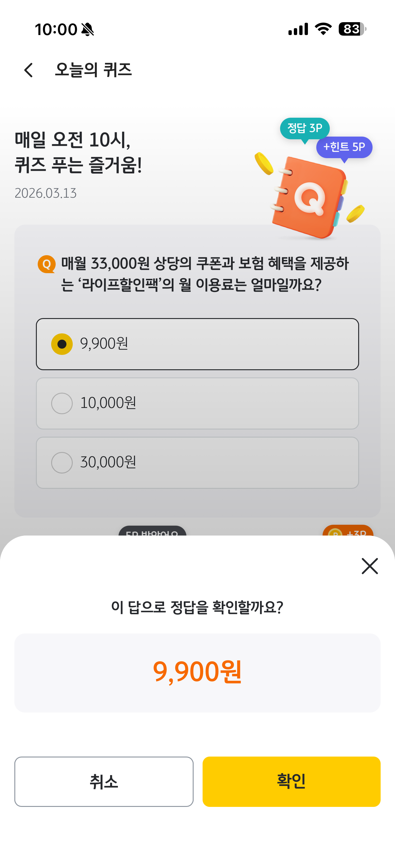 KB Pay 오늘의 퀴즈 정답은 9,900원 입니다