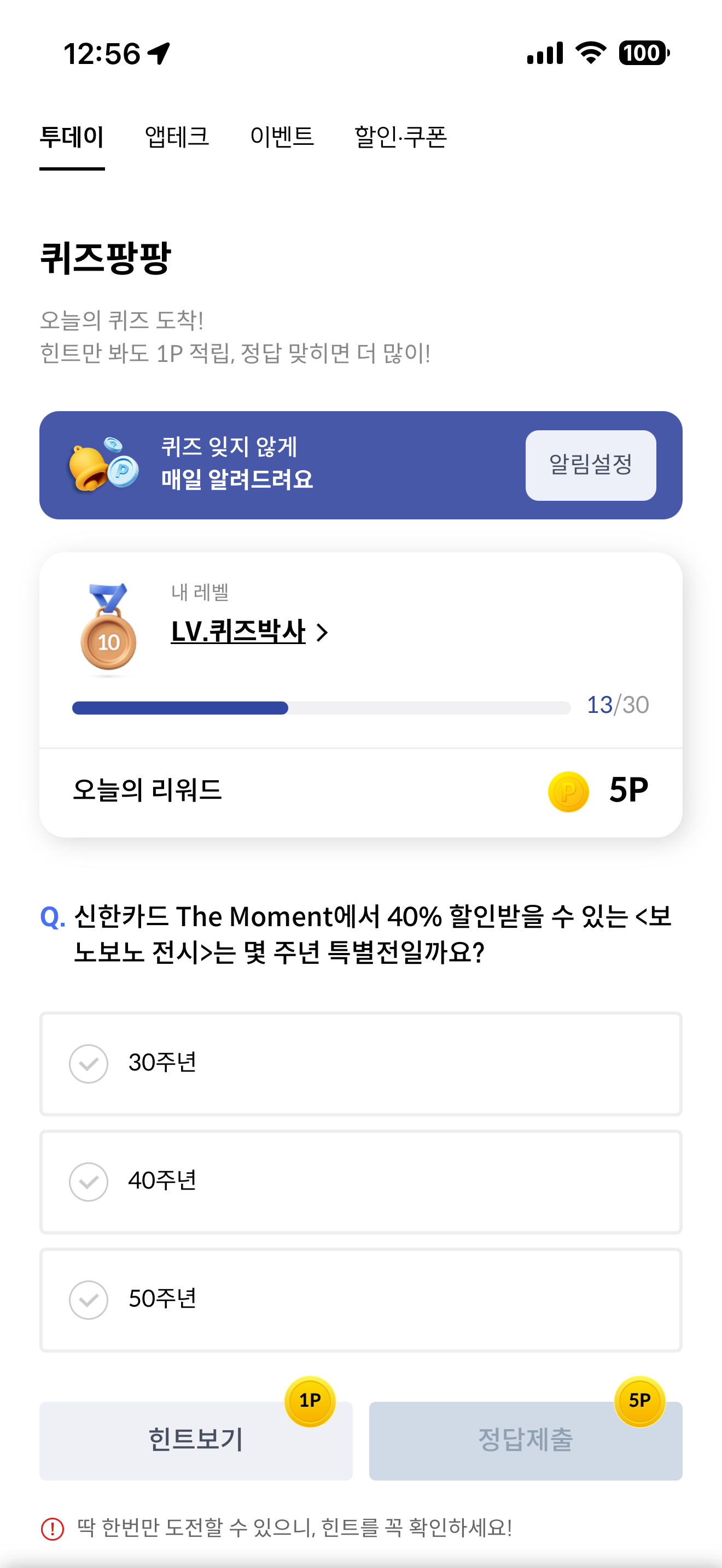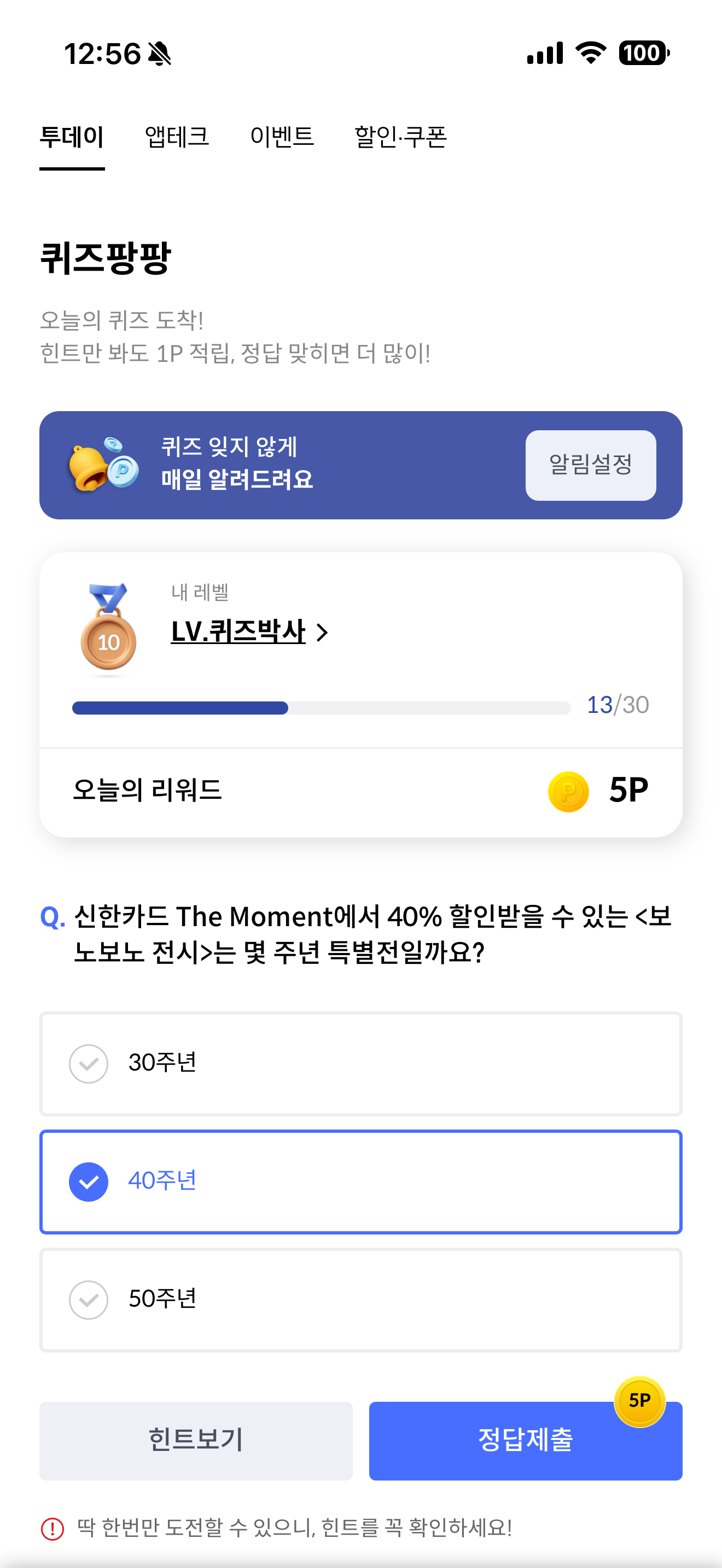 신한카드 퀴즈팡팡 정답은 40주년 입니다