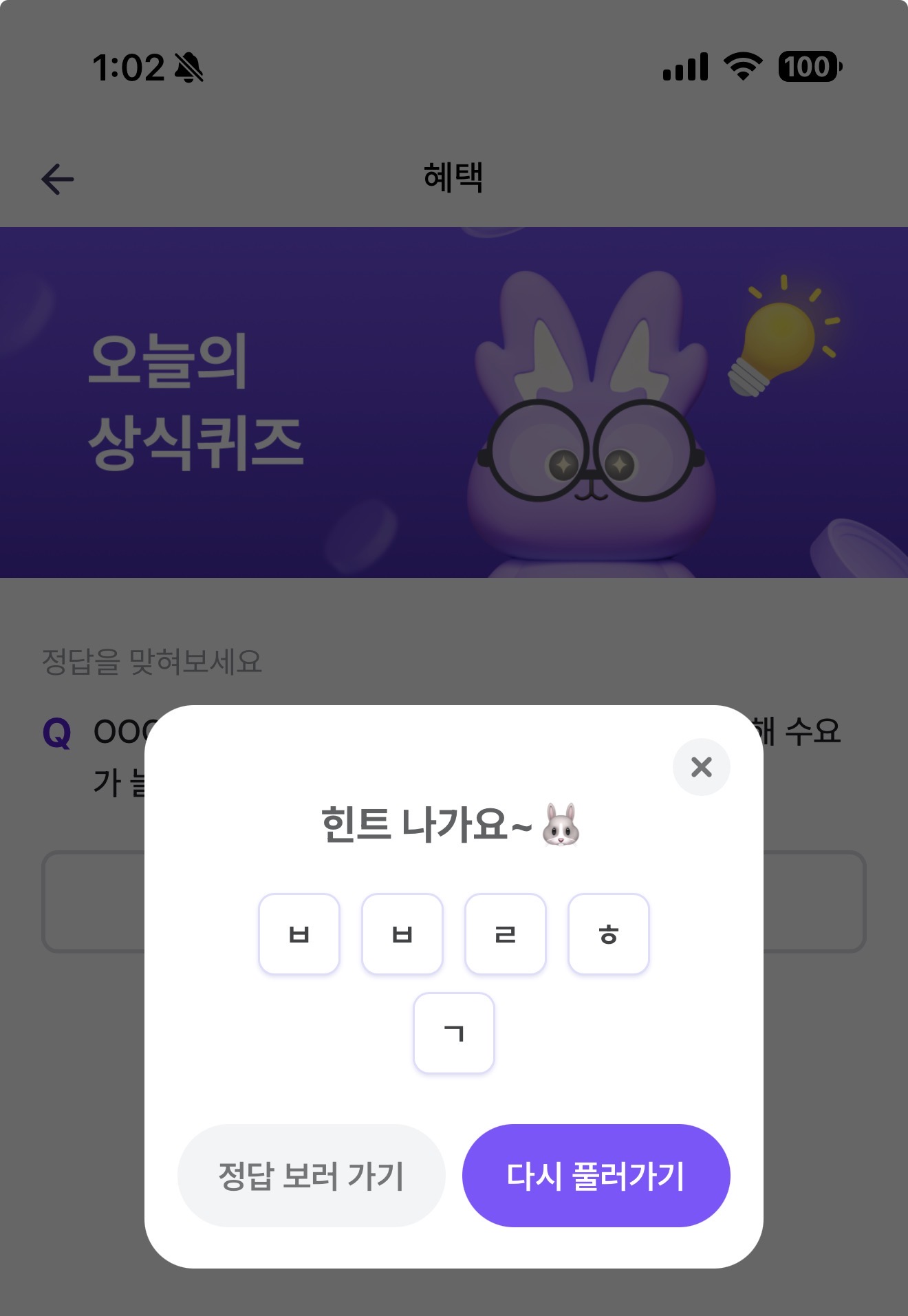 비트버니 오늘의 퀴즈 초성힌트는 ㅂㅂㄹㅎㄱ 입니다