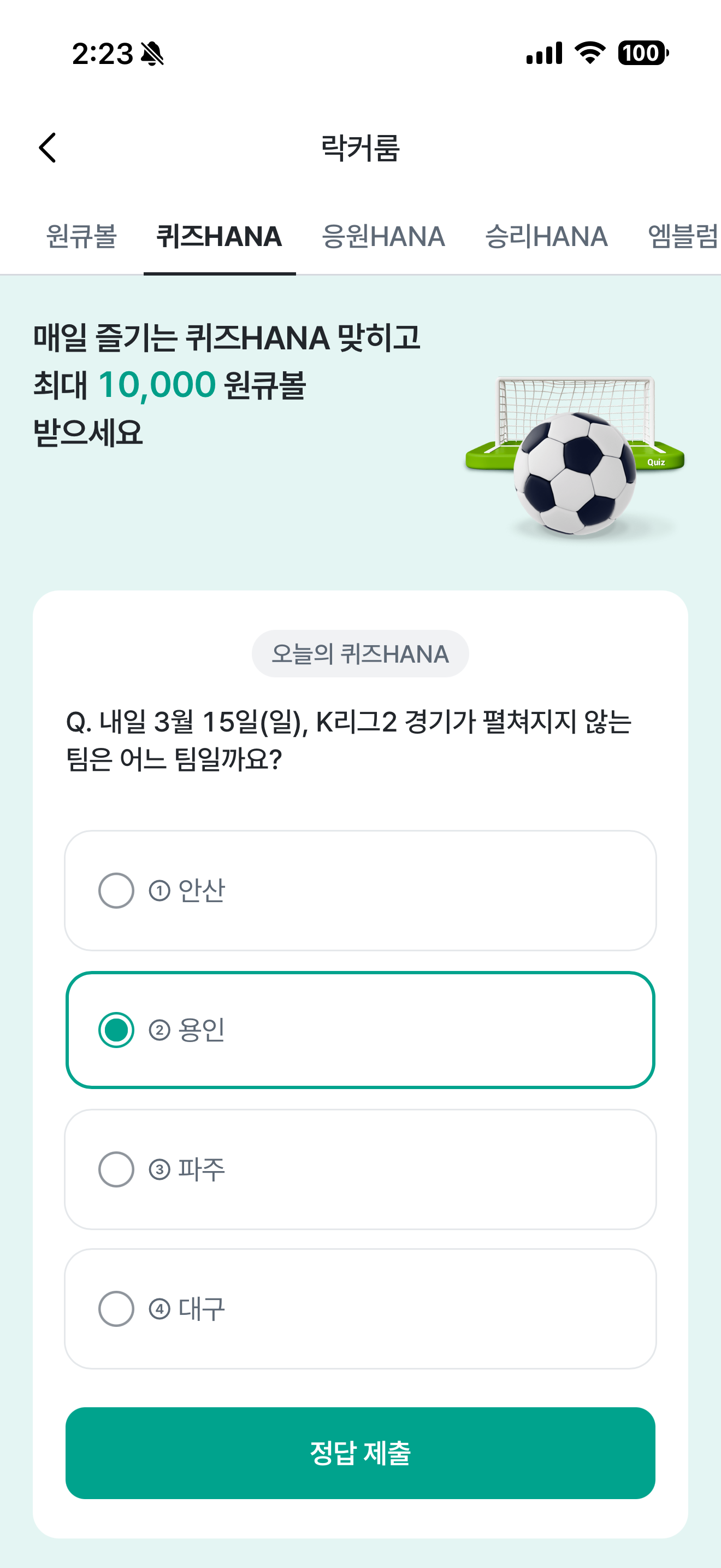 하나원큐 축구 play 퀴즈 HANA 정답은 용인 입니다