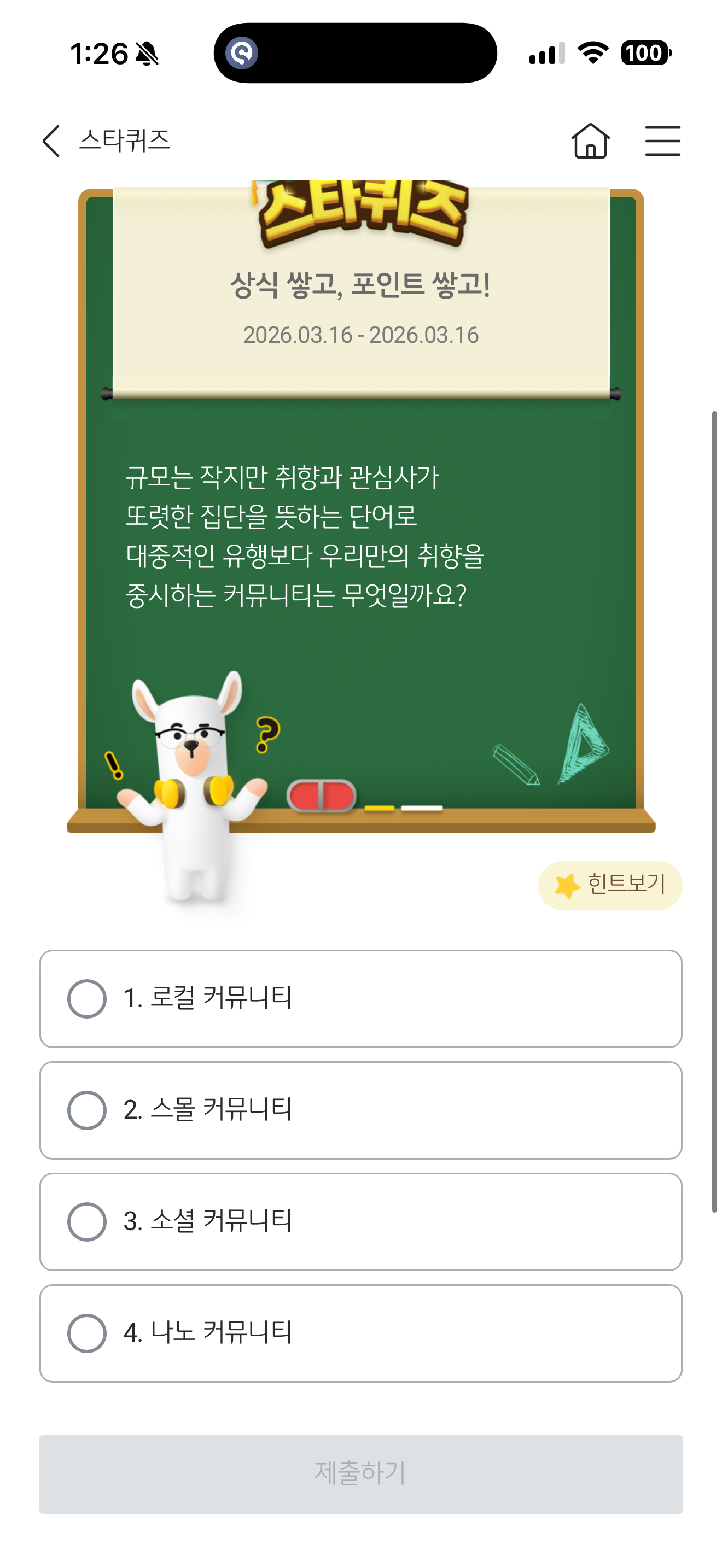 규모는 작지만 취향과 관심사가 또렷한 집단을 뜻하는 단어로 대중적인 유행보다 우리만의 취향을 중시하는 커뮤니티는 무엇일까요? 보기는 1. 로컬 커뮤니티 2. 스몰 커뮤니티 3. 소셜 커뮤니티 4. 나노 커뮤니티 입니다.