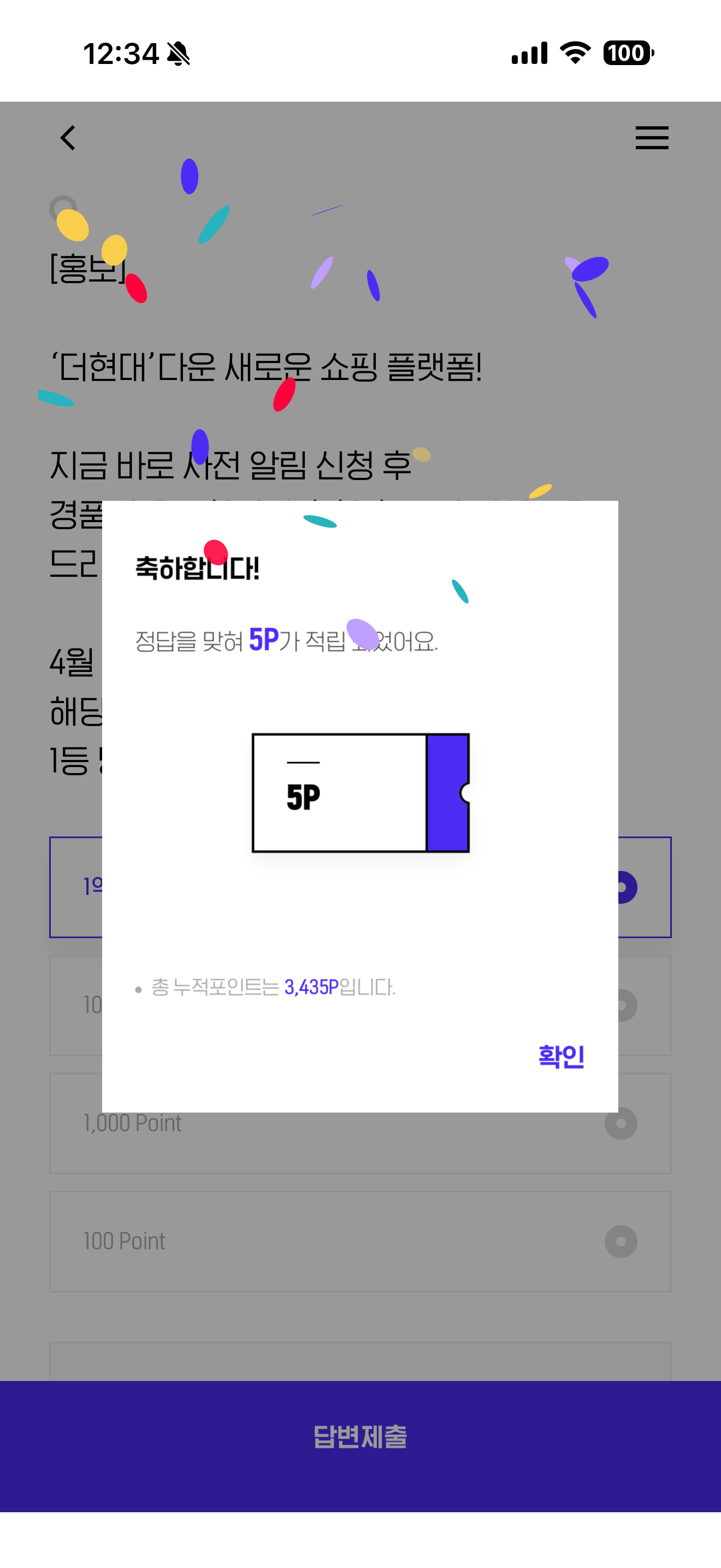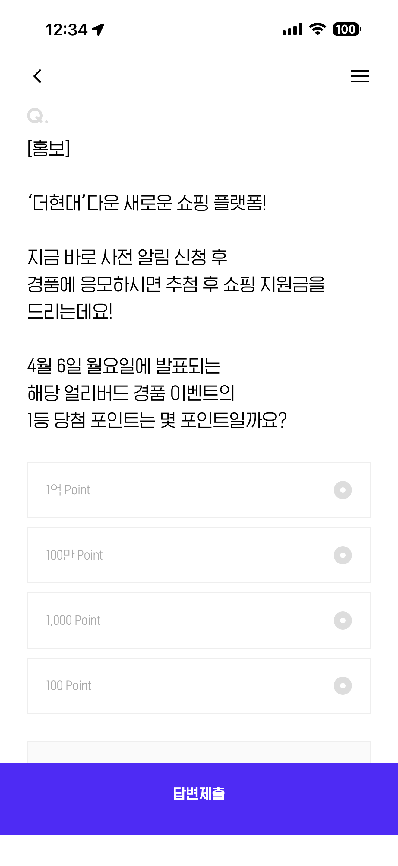 '더현대' 다운 새로운 쇼핑 플랫폼! 지금 바로 사전 알림 신청 후 경품에 응모하시면 추첨 후 쇼핑 지원금을 드리는데요! 4월 6일 월요일에 발표되는 해당 얼리버드 경품 이벤트의 1등 당첨 포인트는 몇 포인트일까요? 보기는 1. 1억 Point 2. 100만 Point 3. 1,000 Point 4. 100 Point 입니다.