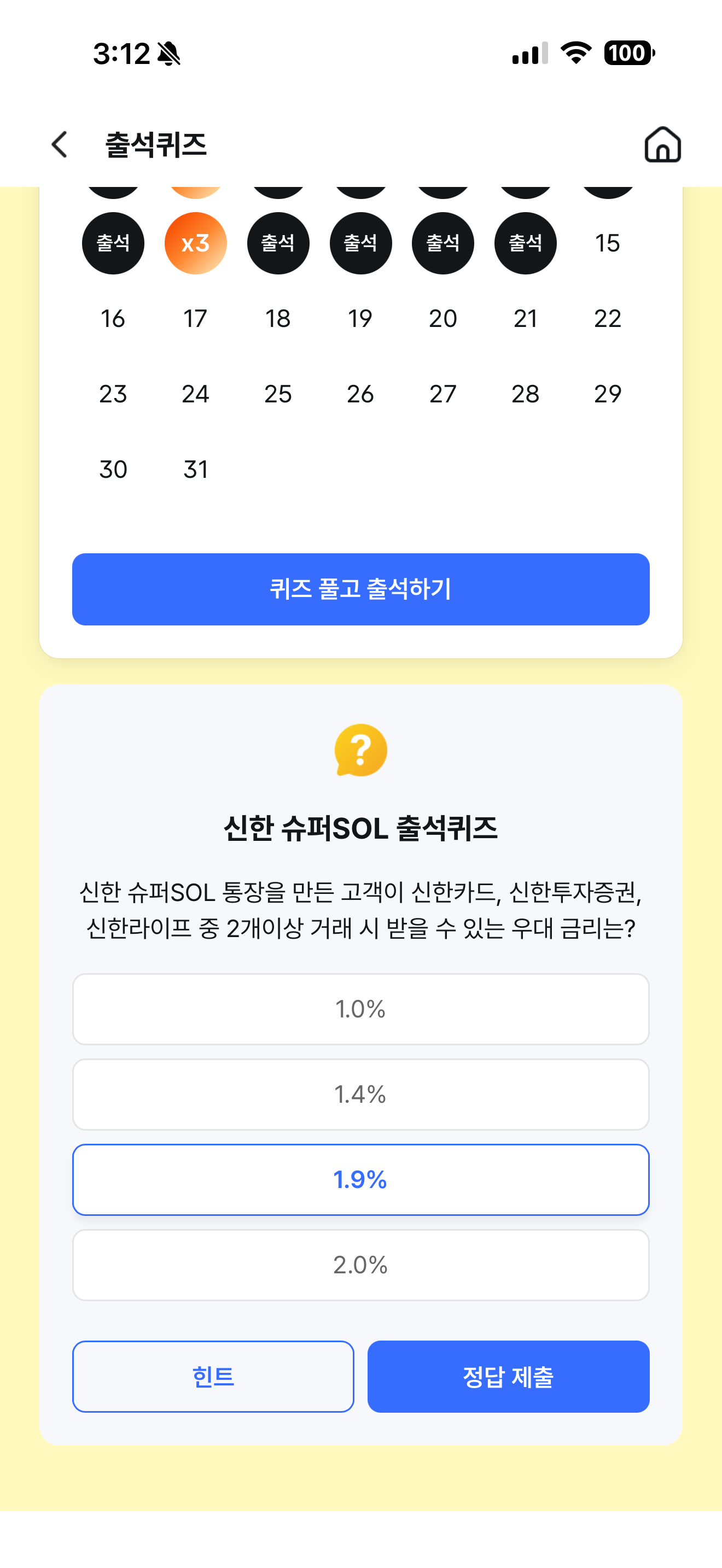 신한 슈퍼SOL 출석퀴즈 정답은 1.9% 입니다