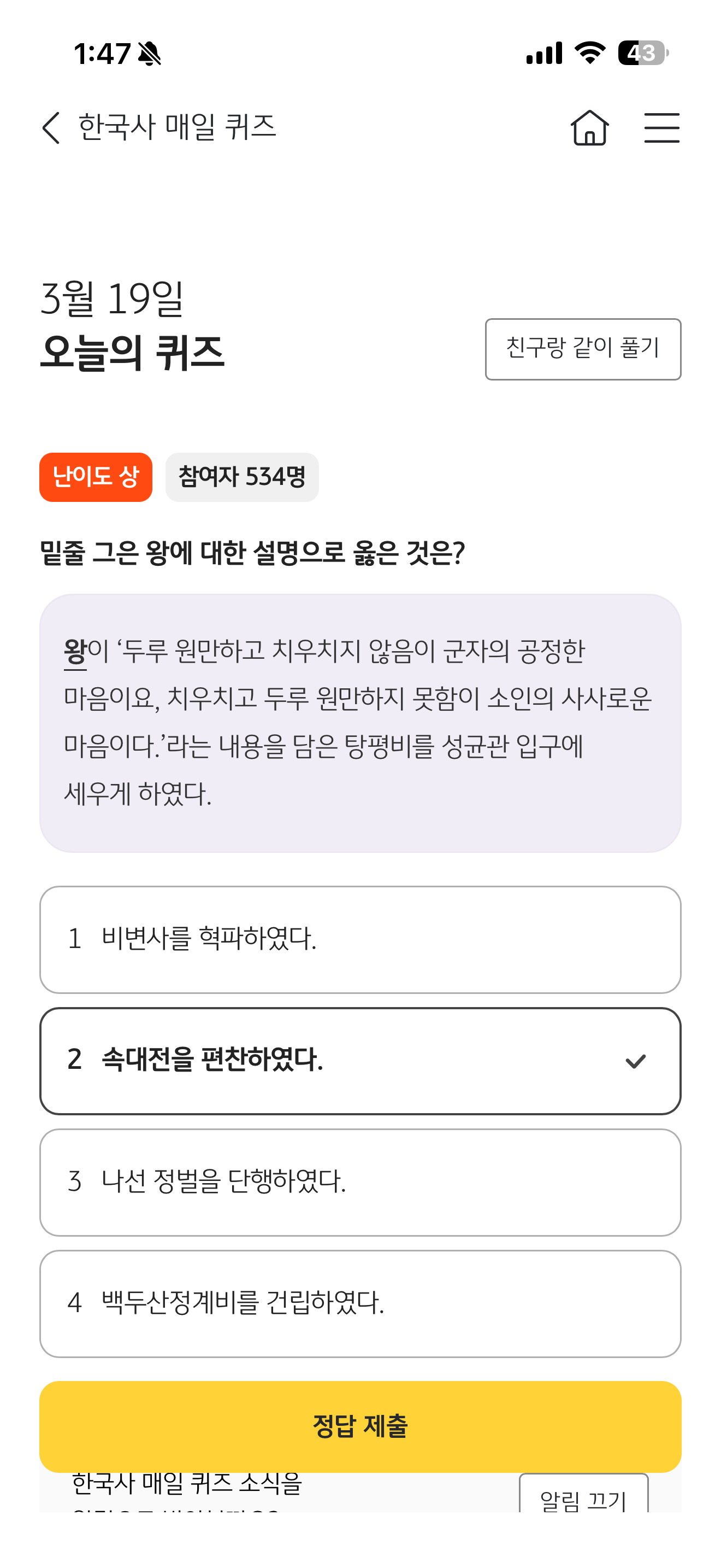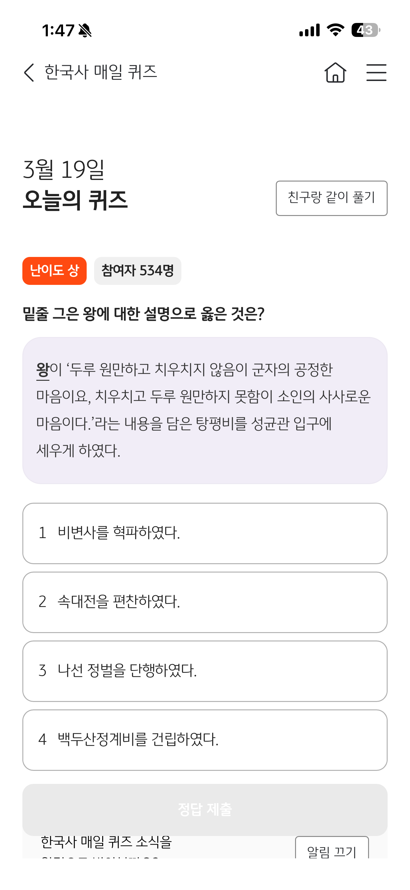 KB스타뱅킹 한국사 매일 퀴즈 3월 19일 문제입니다