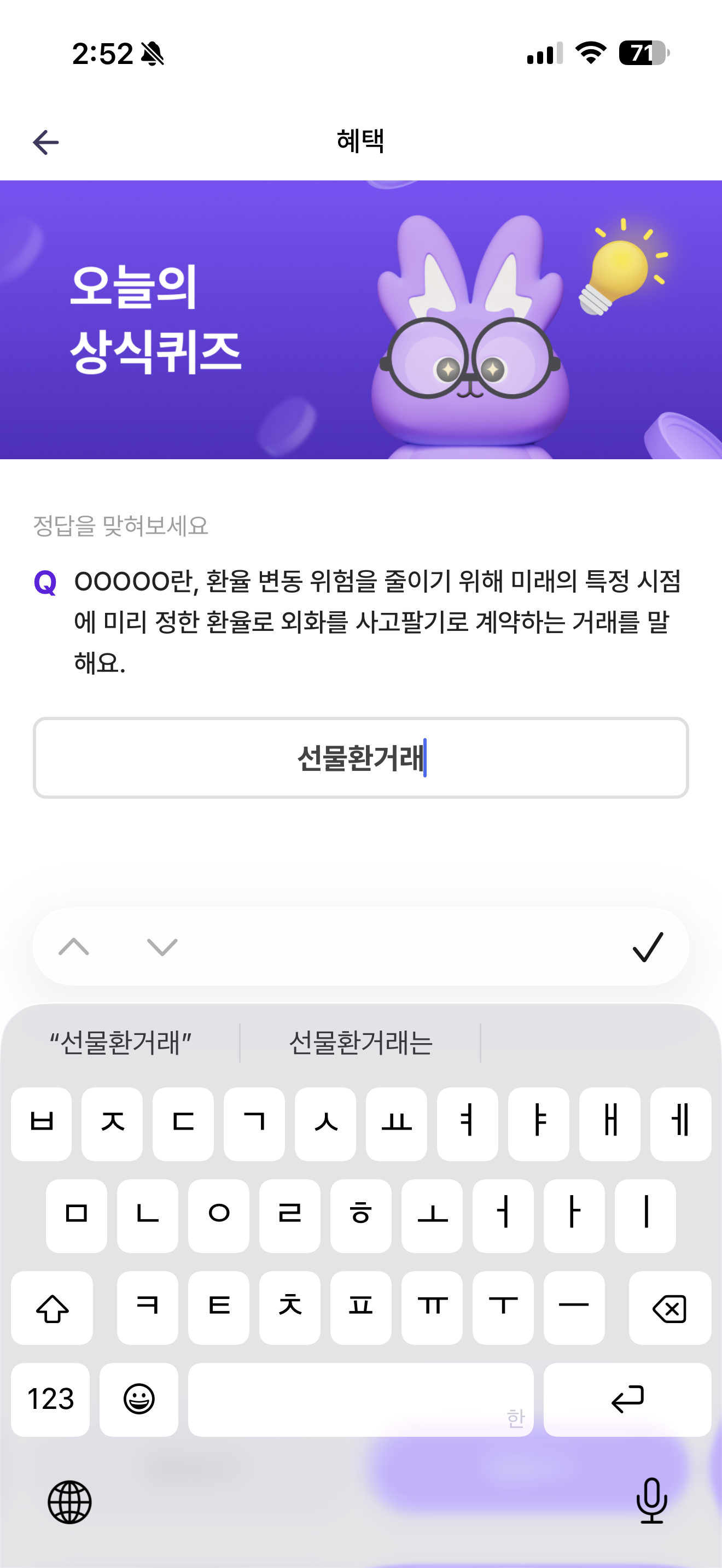 OOOOO란, 환율 변동 위험을 줄이기 위해 미래의 특정 시점에 미리 정한 환율로 외화를 사고팔기로 계약하는 거래를 말해요. 주관식 퀴즈인데요.