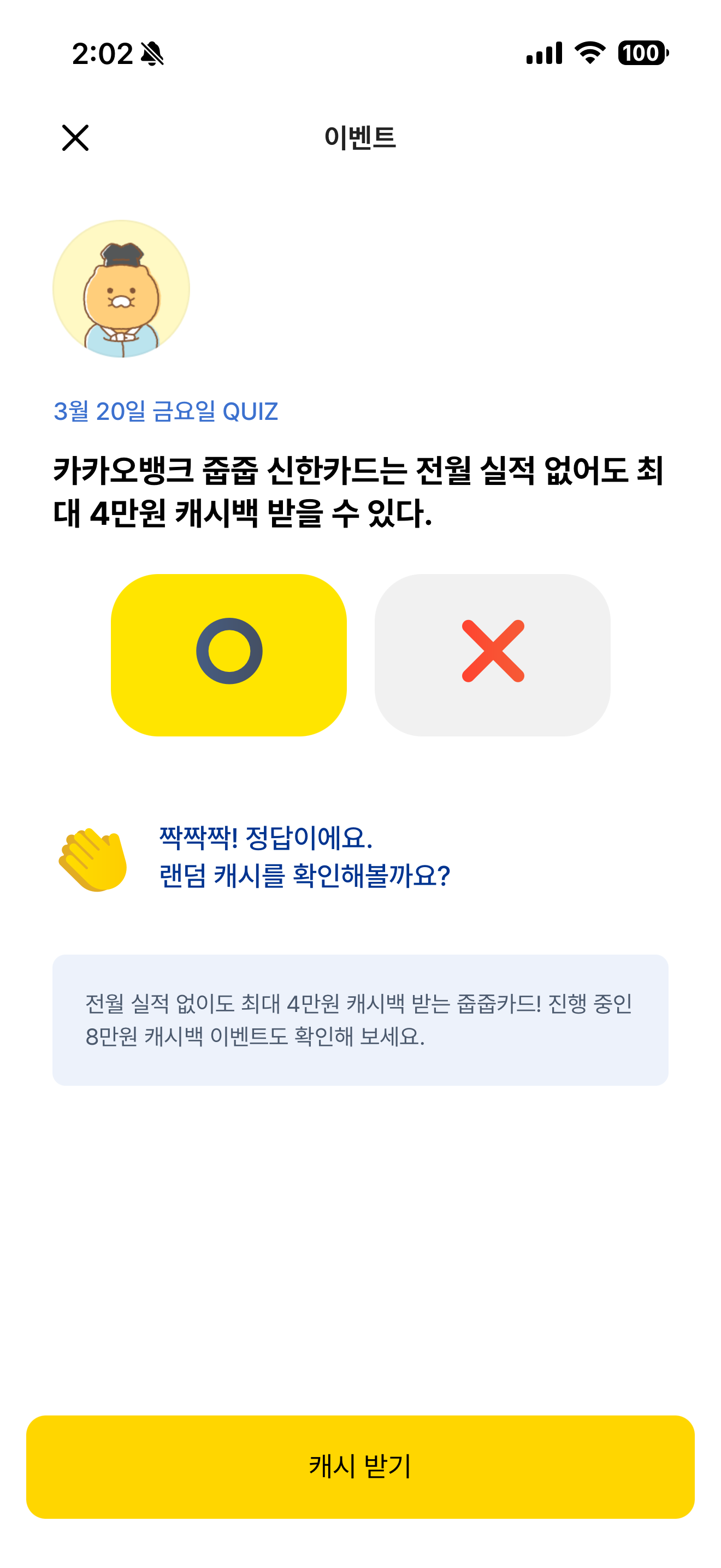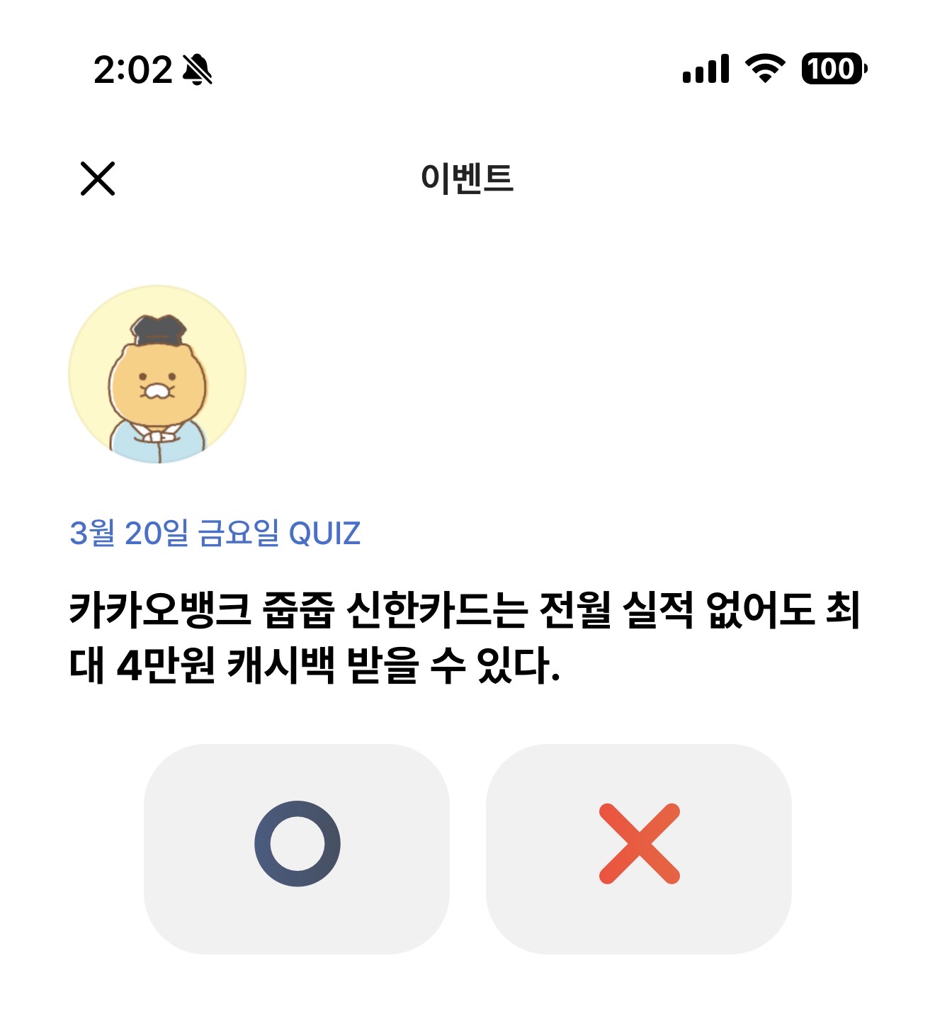 카카오뱅크 OX 퀴즈 3월 20일 정답(카카오뱅크 줍줍 신한카드는 전월 실적 없어도 최대 4만원 캐시백 받을 수 있다)