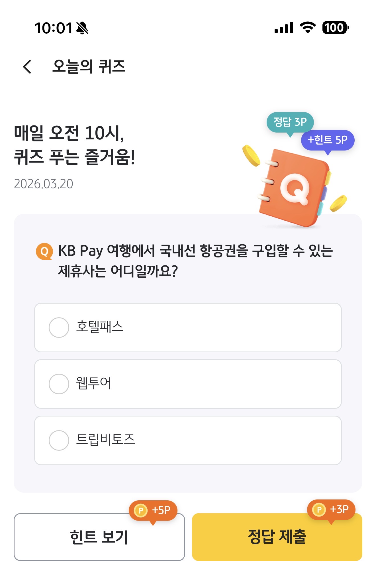 KB Pay 오늘의 퀴즈 3월 20일 문제입니다