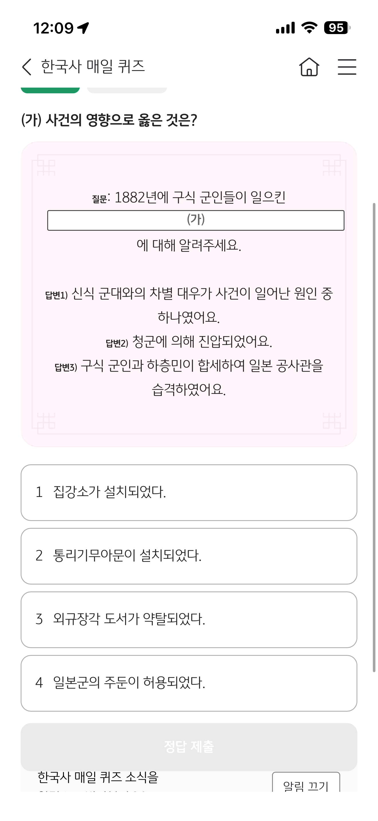 1882년에 구식 군인들이 일으킨 (가) 에 대해 알려주세요. 답변1) 신식 군대와의 차별 대우가 사건이 일어난 원인 중 하나였어요. 답변2) 청군에 의해 진압되었어요. 답변3) 구식 군인과 하층민이 합세하여 일본 공사관을 습격하였어요
