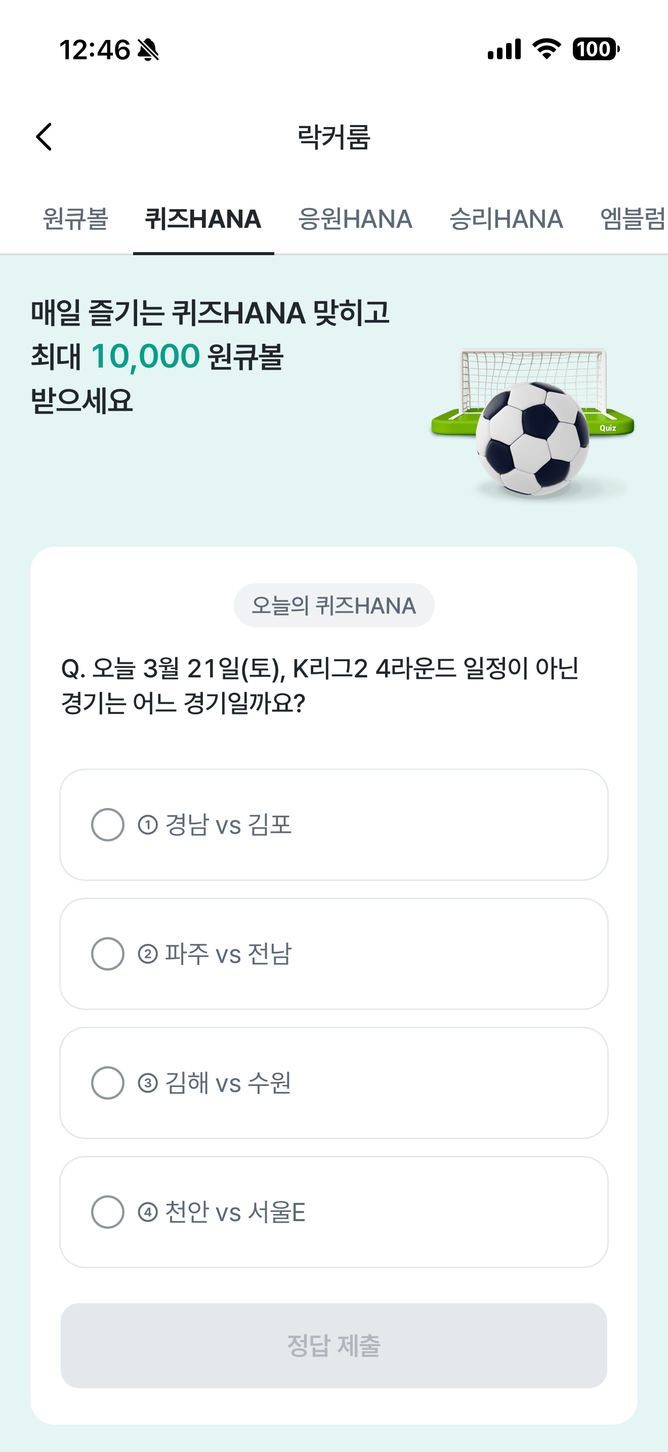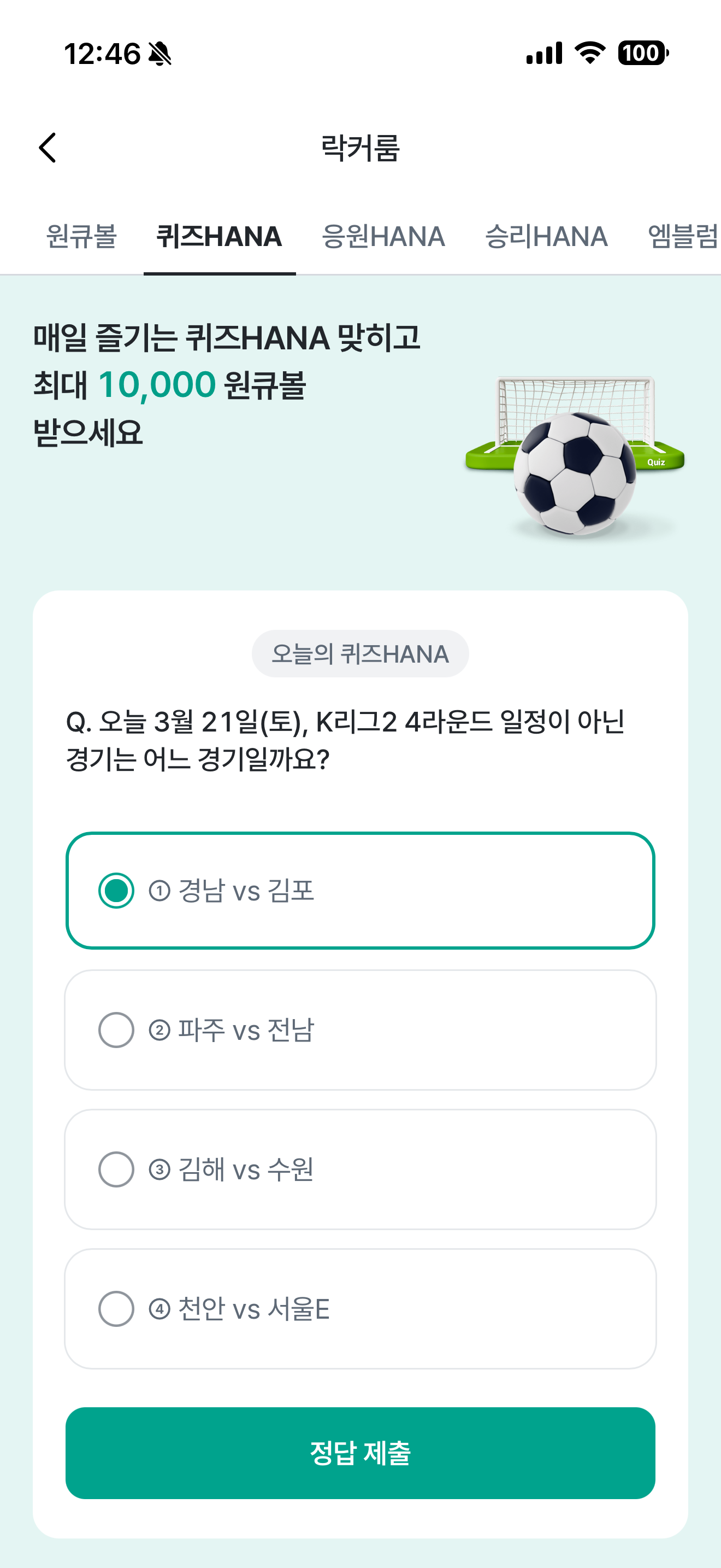 하나원큐 축구 play 퀴즈 HANA 정답은 경남 vs 김포 입니다
