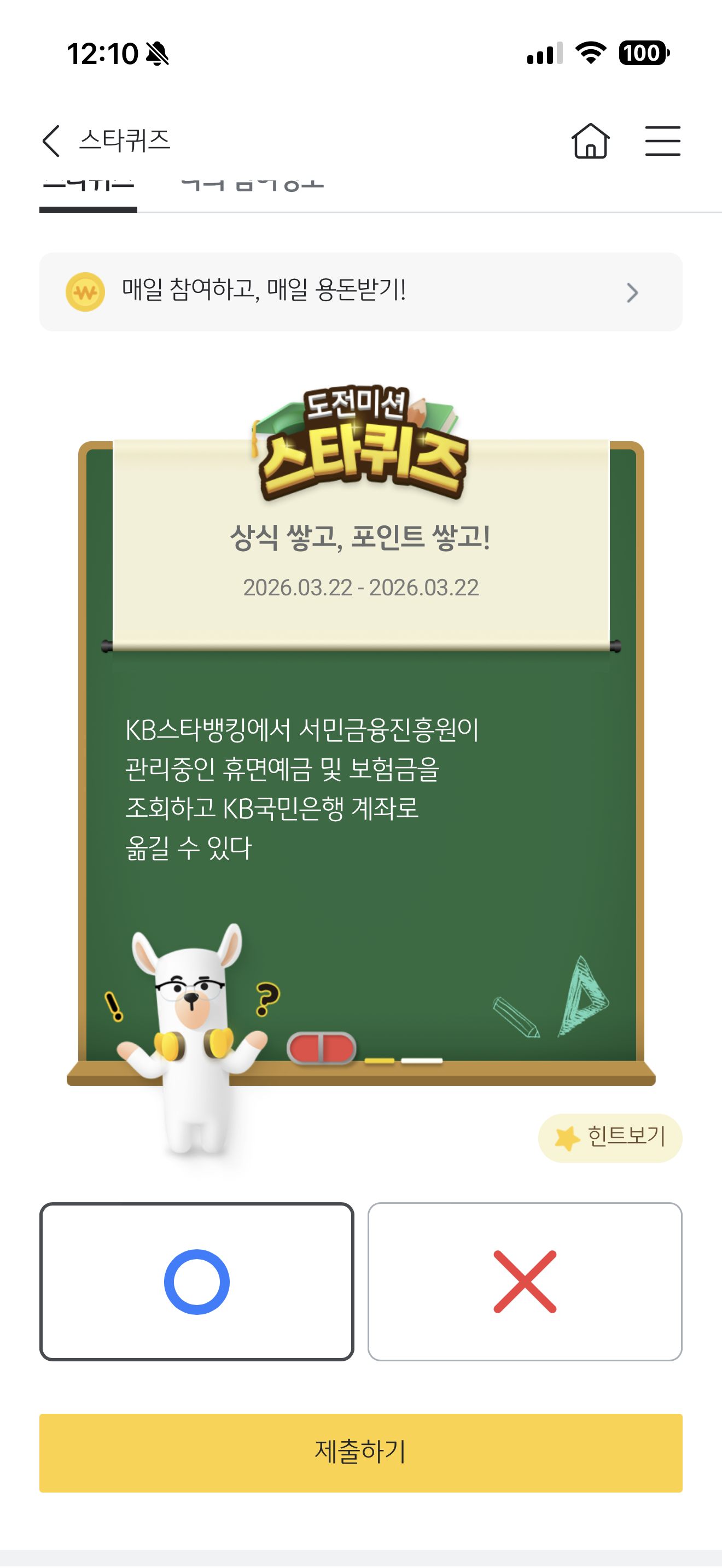 KB스타뱅킹 스타퀴즈 3월 22일 정답(KB스타뱅킹에서 서민금융진흥원이 관리중인 휴면예금 및 보험금을 조회하고 KB국민은행 계좌로 옮길 수 있다)