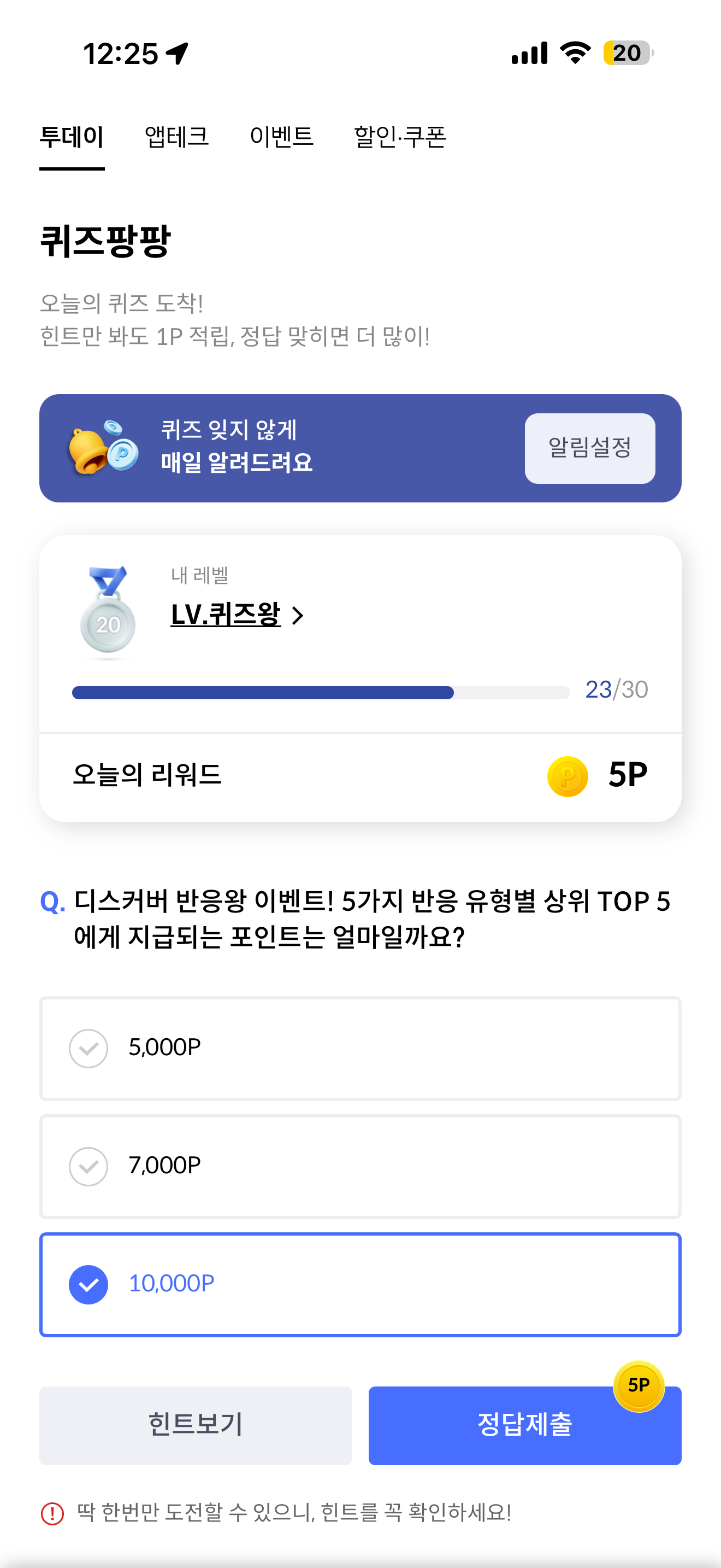 디스커버 반응왕 이벤트! 5가지 반응 유형별 상위 TOP 5에게 지급되는 포인트는 얼마일까요? 보기는 1. 5,000P 2. 7,000P 3. 10,000P 입니다