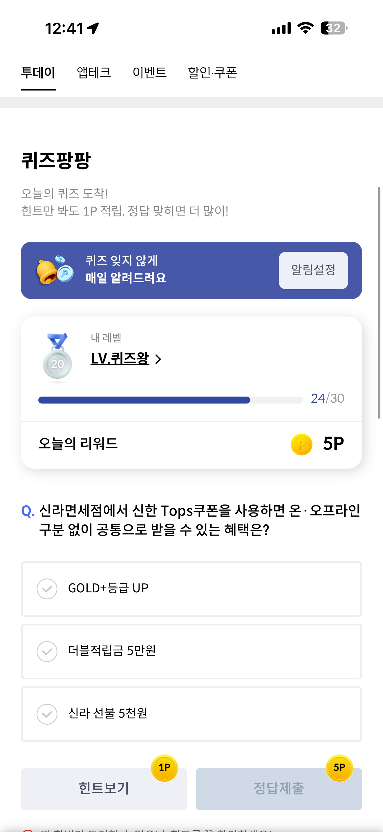 신라면세점에서 신한 Tops쿠폰을 사용하면 온 오프라인 구분 없이 공통으로 받을 수 있는 혜택은? 보기는 1. GOLD+등급 UP 2. 더블적립금 5만원 3. 신라 선불 5천원 입니다