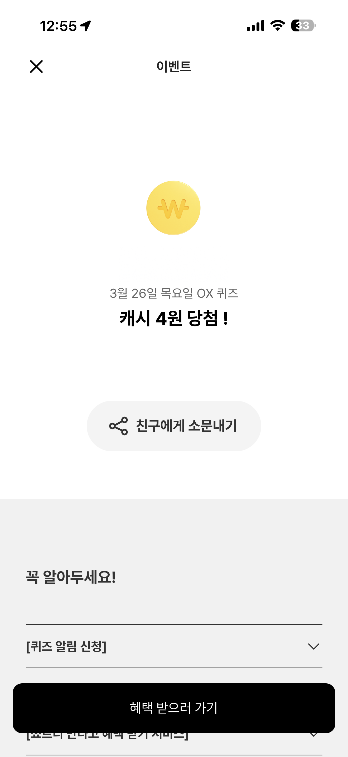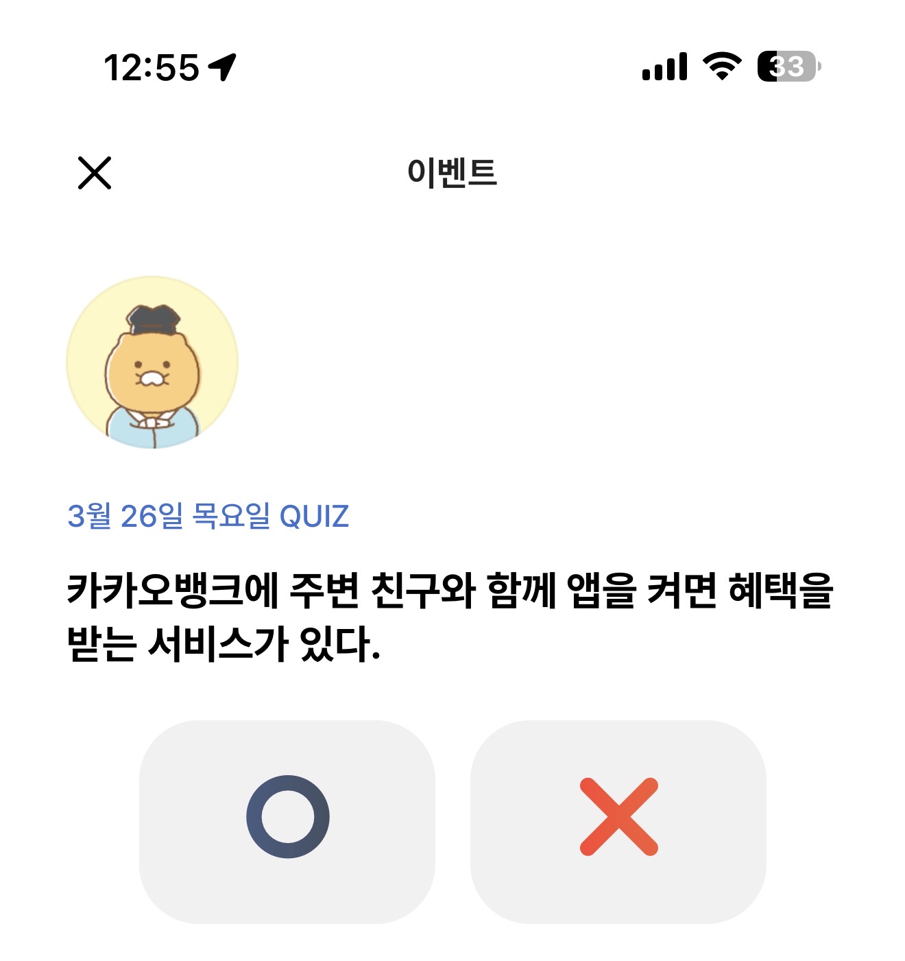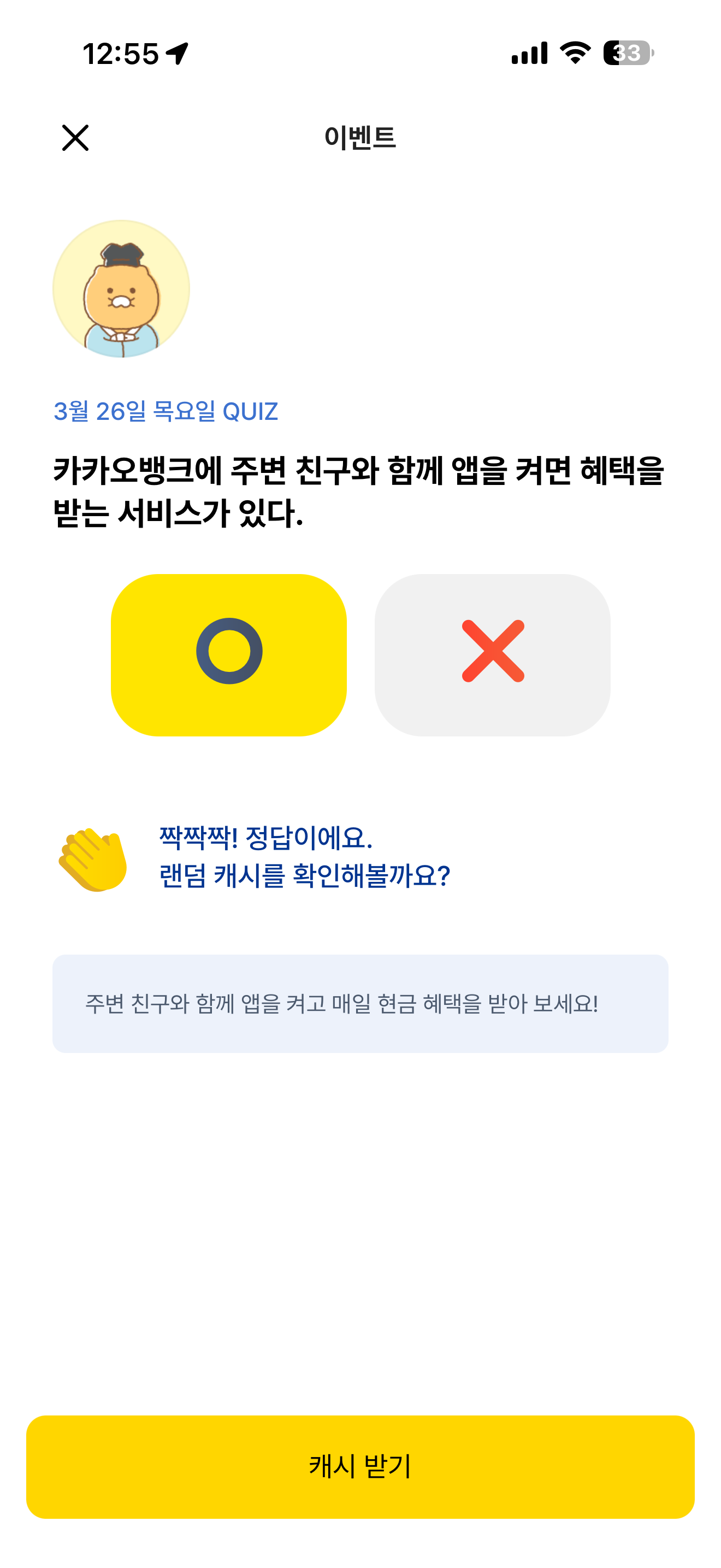 카카오뱅크에 주변 친구와 함께 앱을 켜면 혜택을 받는 서비스가 있다 O, X 퀴즈인데요. 카카오뱅크를 주변 친구와 함께 켤 수 있을까요?