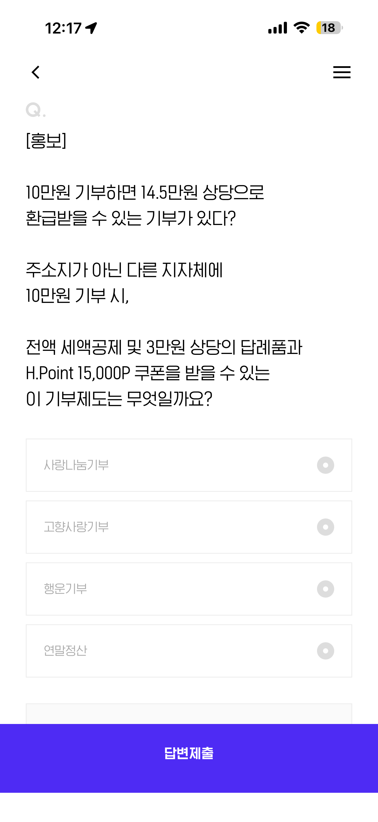 H포인트 퀴즈 정답은 고향사랑기부 입니다