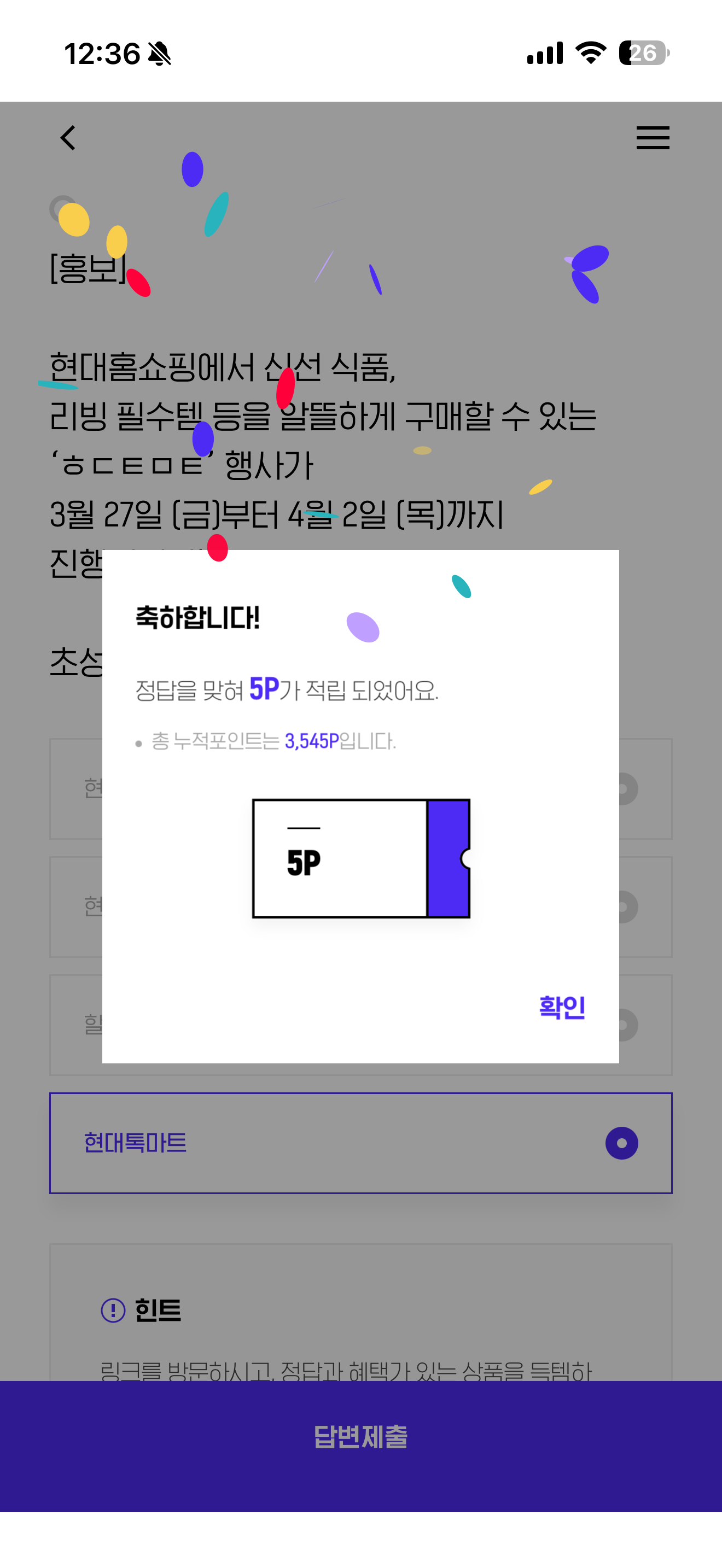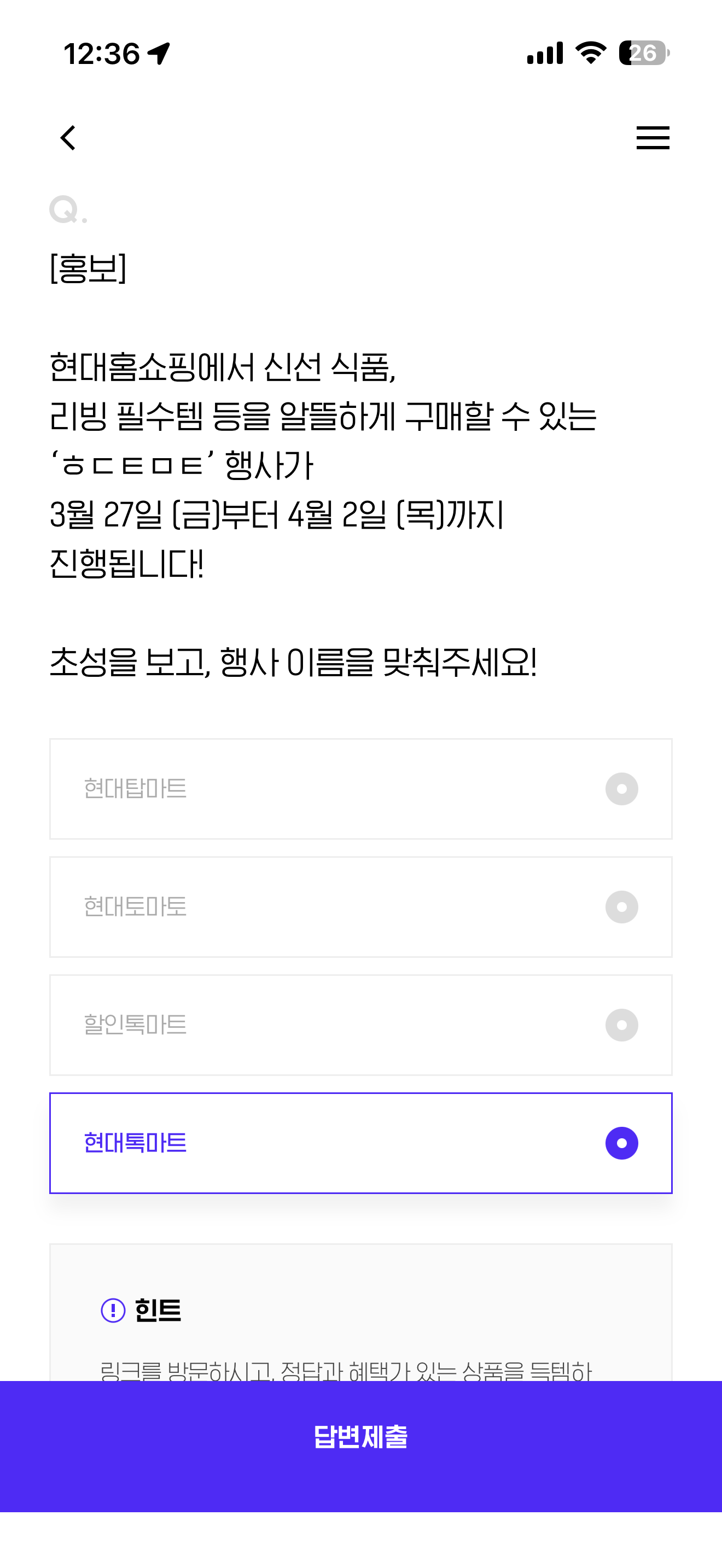 H포인트 퀴즈 정답은 현대톡마트 입니다